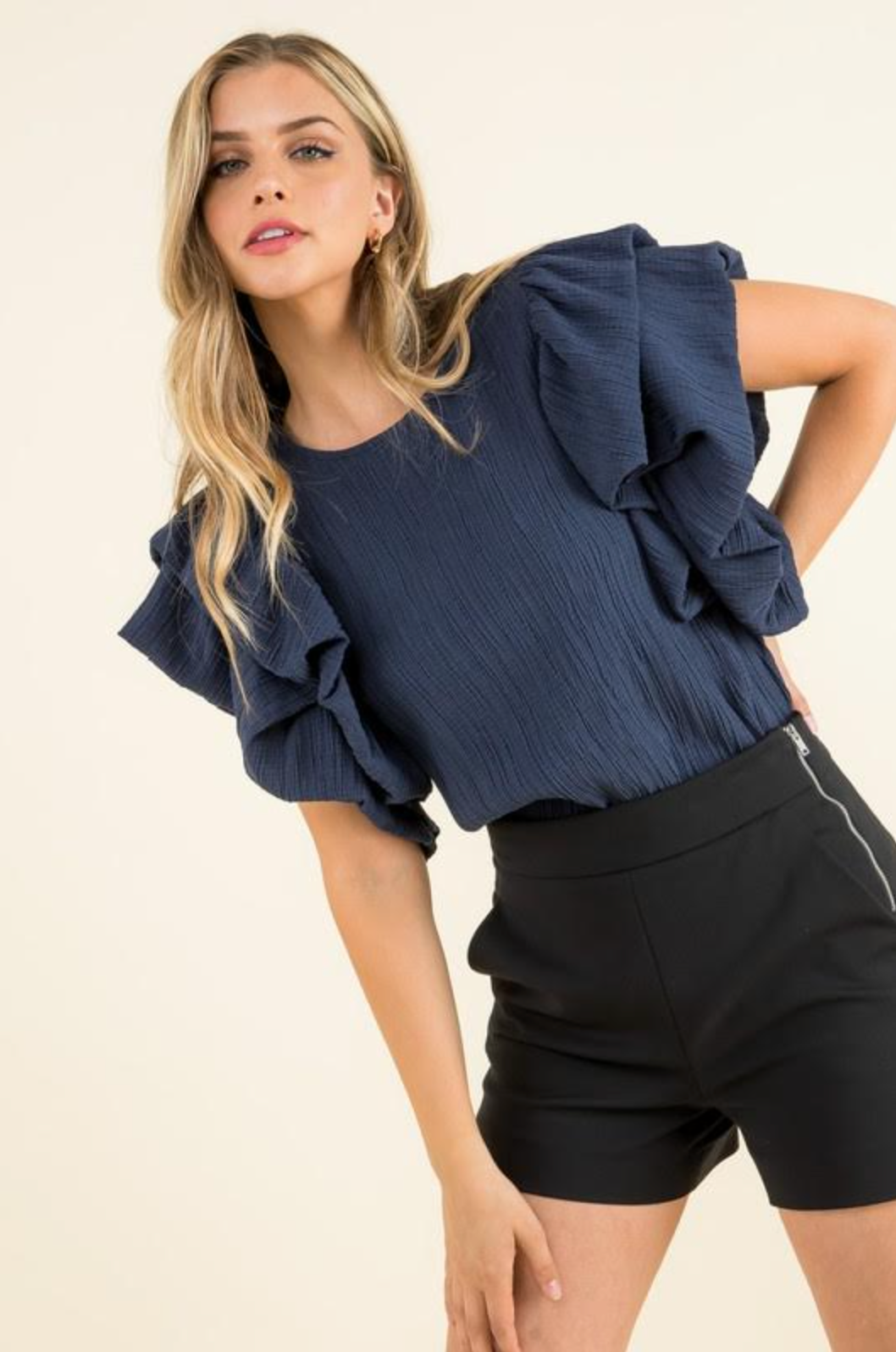 This blouse has a dramatic puff shoulder detail. It is simple and easy to wear with any bottoms. Looks great with jeans or dress pants.