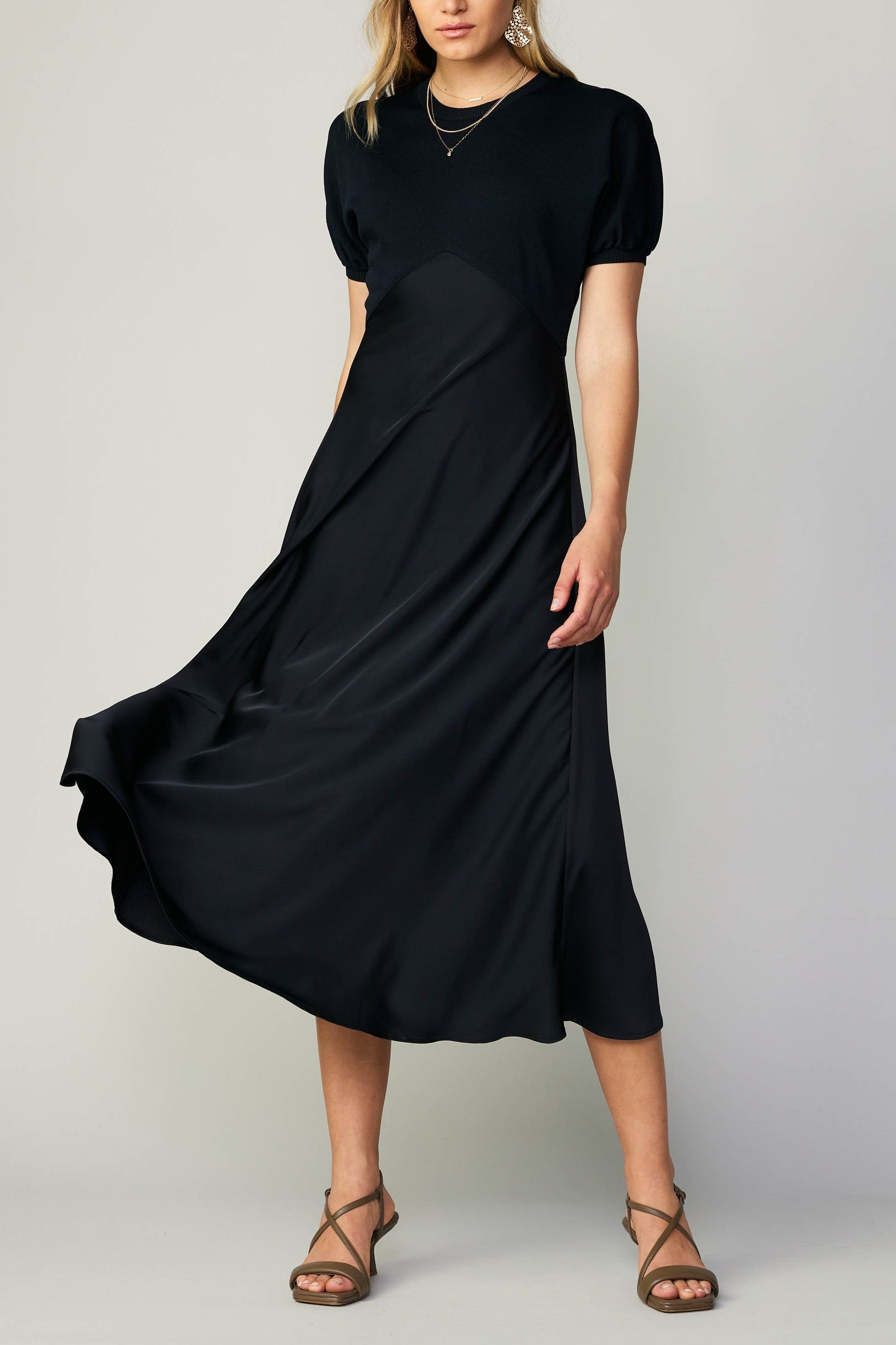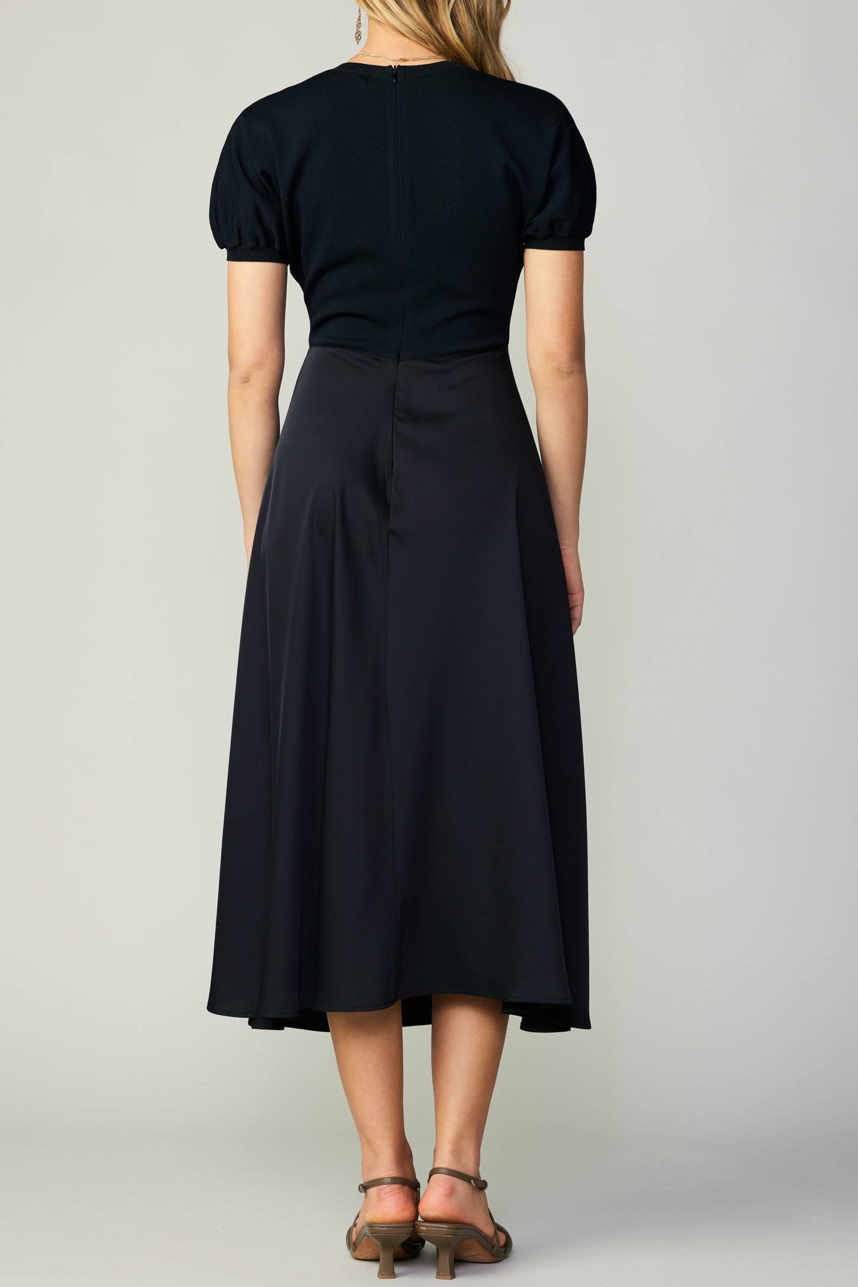This puff sleeve dress is elegant with the sweater top adding a unique detail to the piece. This would be a beautiful option for a date night or to get dressed up for an occasion.