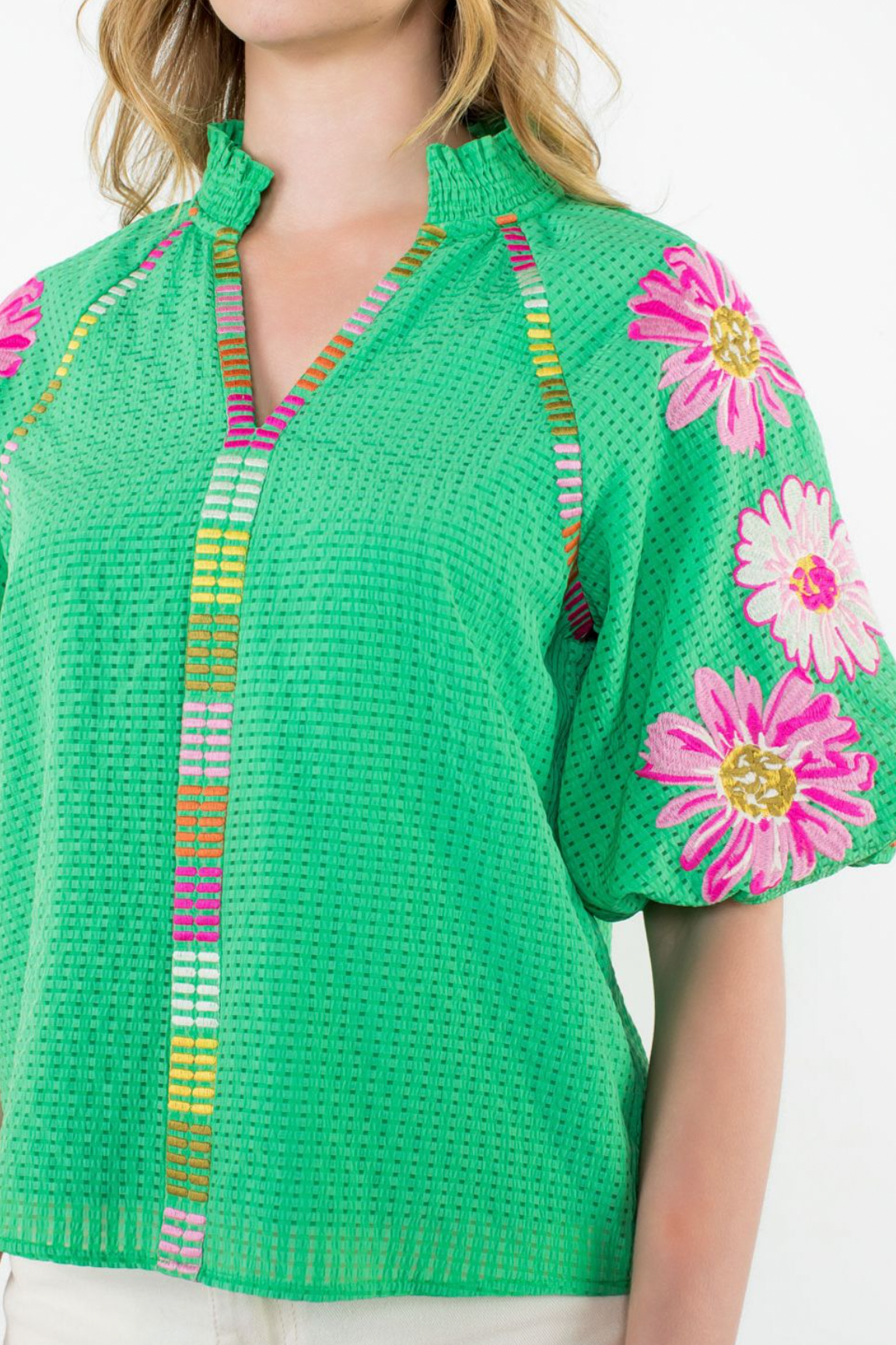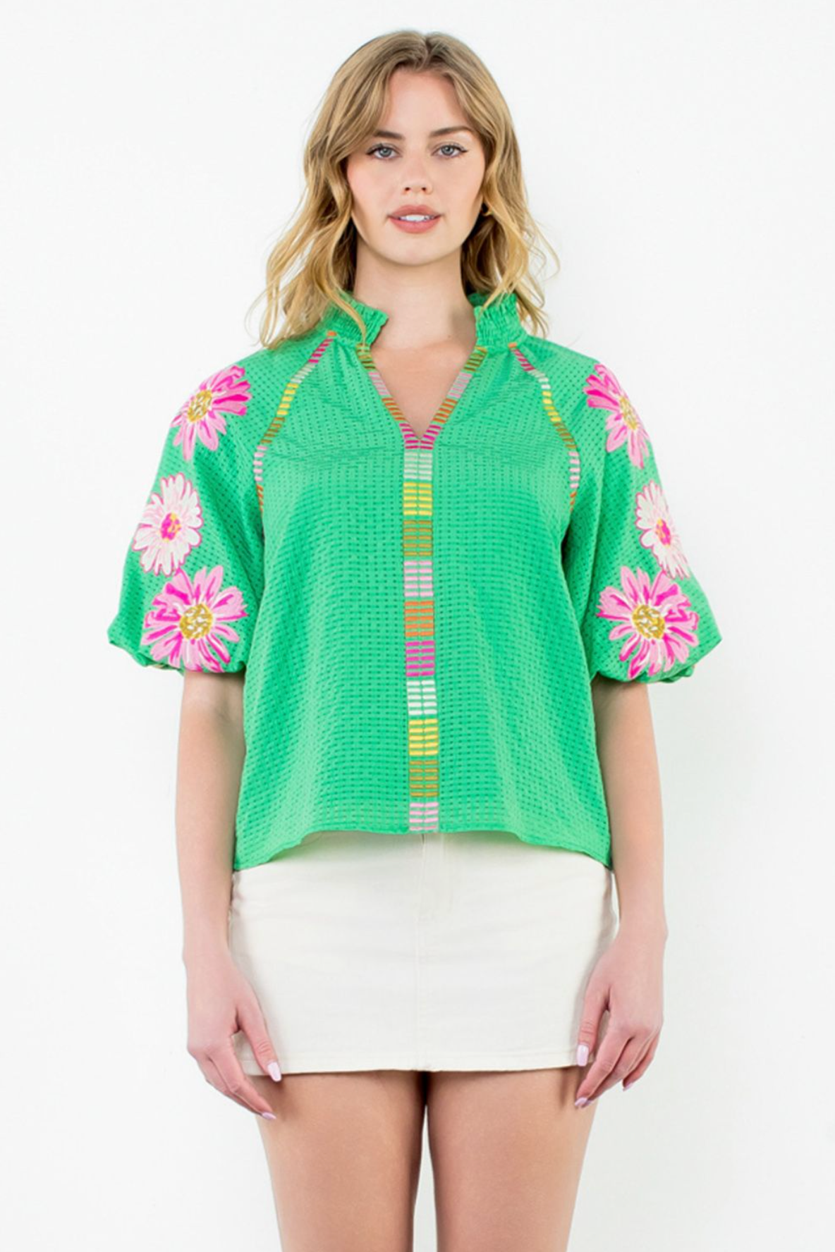 This vibrant Puff Sleeve Embroidered Top has a loose textured design. Featuring short slightly puffed sleeves decorated with bold floral embroidery. The top has a v neckline and colorful striped detailing running down the front, adding a playful touch.