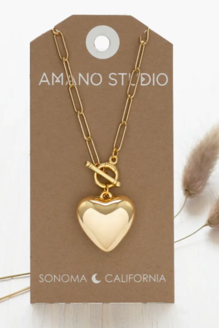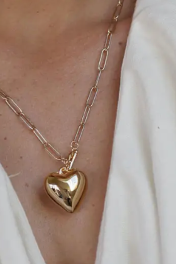 Vintage 90's style puffed heart on a 20" toggle chain. The heart measures .75" in length. 14k gold plated brass.