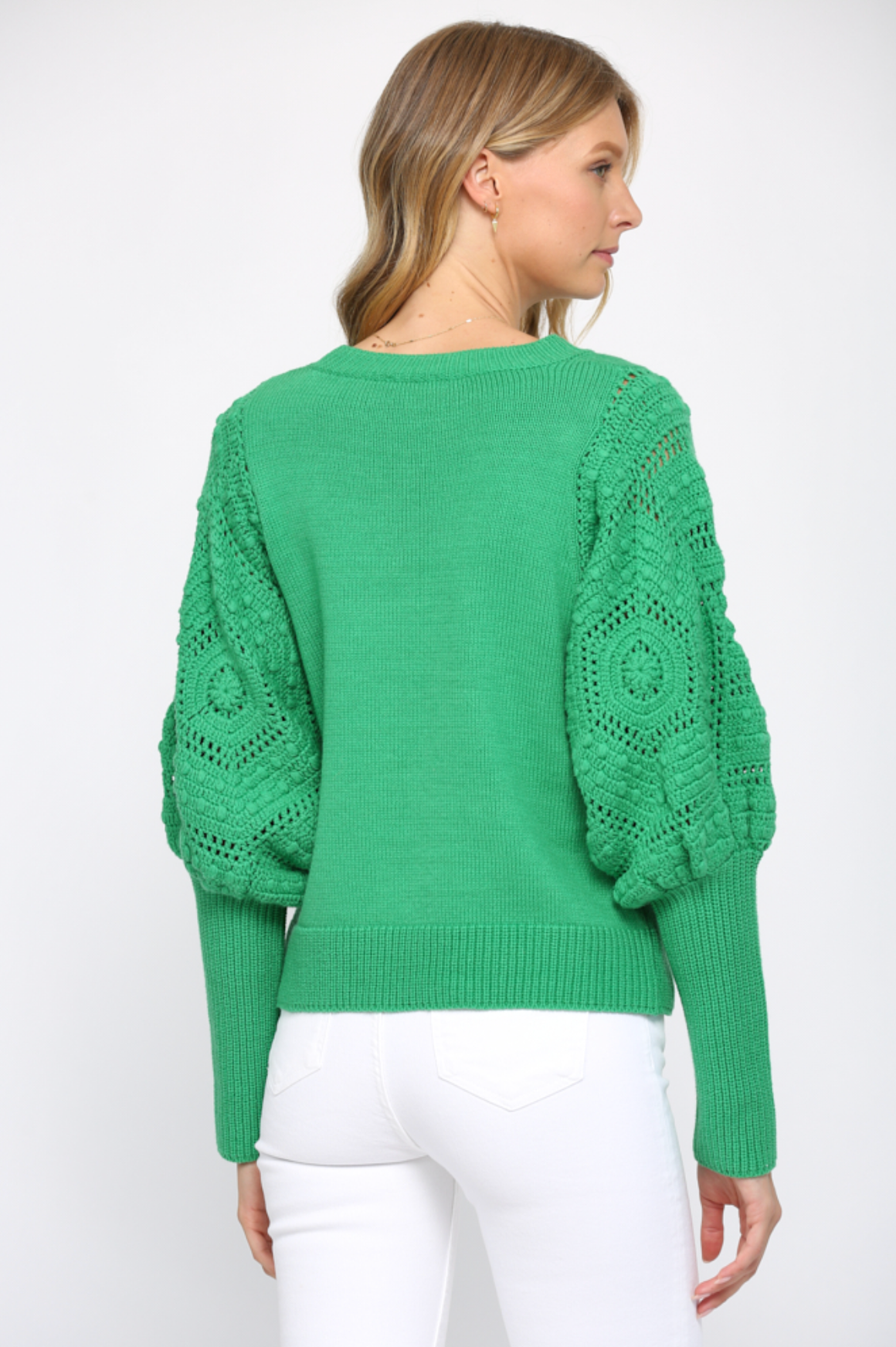 This knit green sweater is a great pop of color. Looks great worn casually, to the office, or out for dinner. The knit sleeves are a great detail.