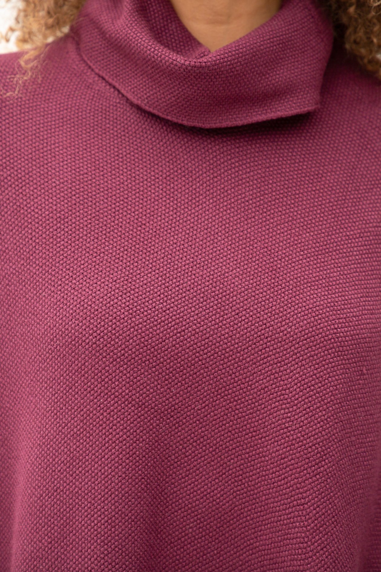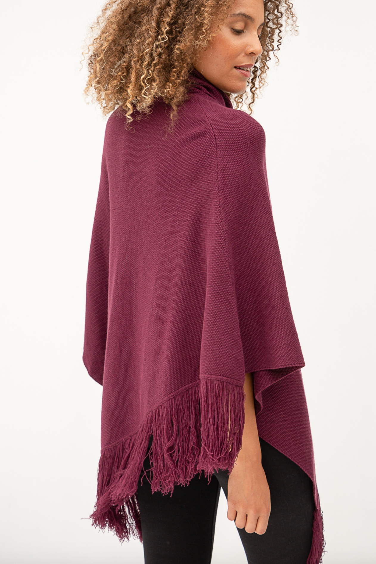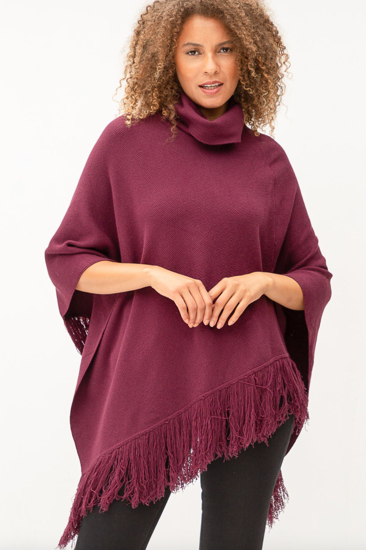 Turtleneck and asymmetric fringe hem poncho. Looks great with a fitted bottoms like leggings or jeans.