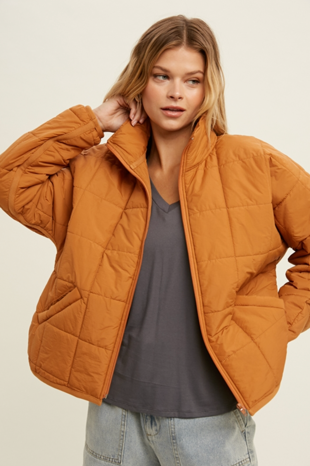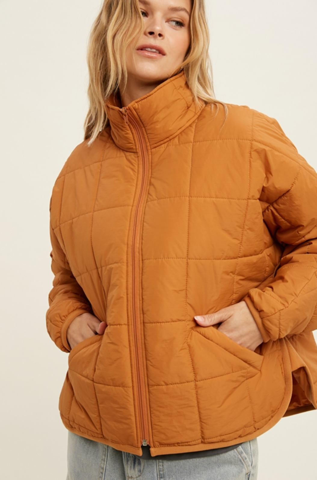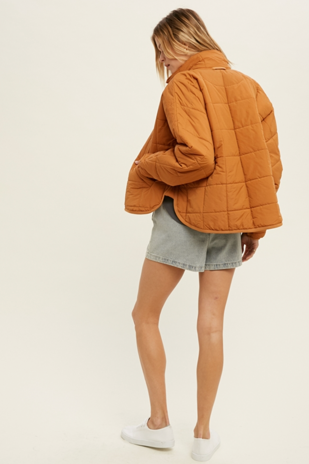 This quilted jacket is a perfect fall color. A great length before it gets too cold. Looks great with black or blue jeans or mens wear style dress pants.