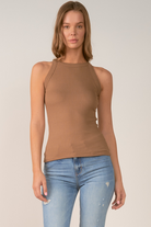 This racerback tank has a high-neck and is great to layer with or along with any bottoms you want.