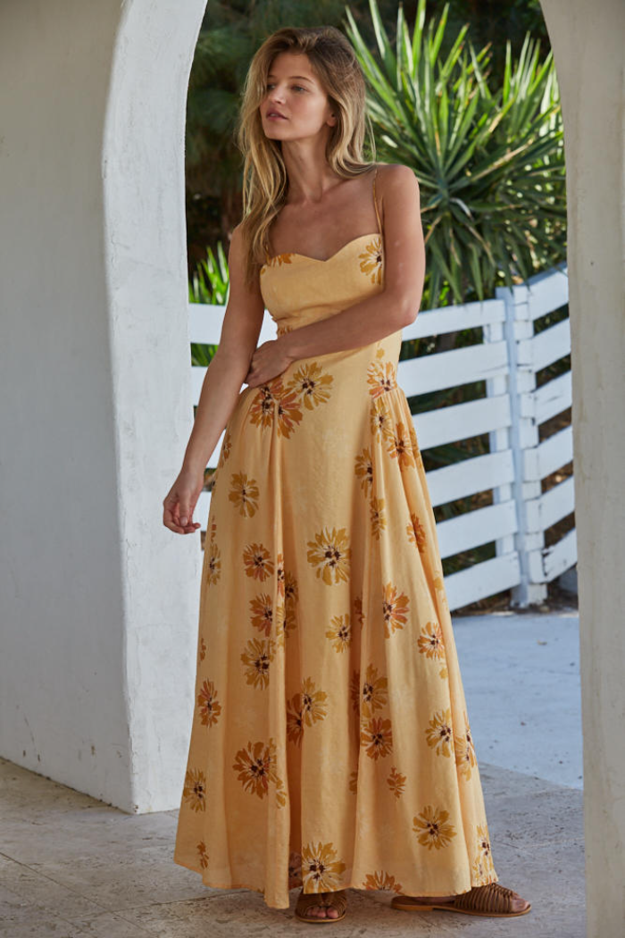 Woven Cotton Rayon Floral Print Sweetheart Neck Spaghetti Strap Open Back Flare Maxi Dress With Cotton Lining And Back Zipper