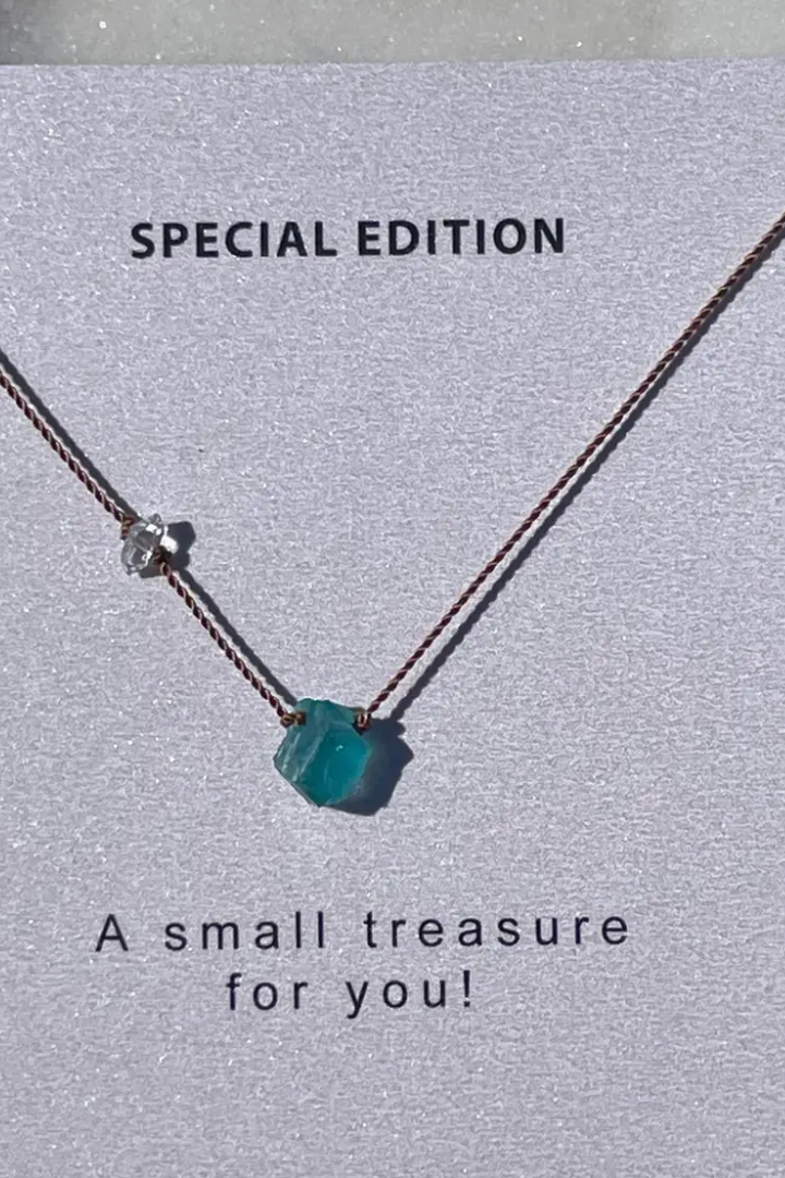 Special Edition necklace featuring a small, raw neon-blue apatite gemstone with tiny herkimer diamond quartz accent bead hand knotted on a durable nylon cord. Finished with a sterling silver spring ring clasp and made to 17". Necklace comes on a pretty card with stone meaning.
