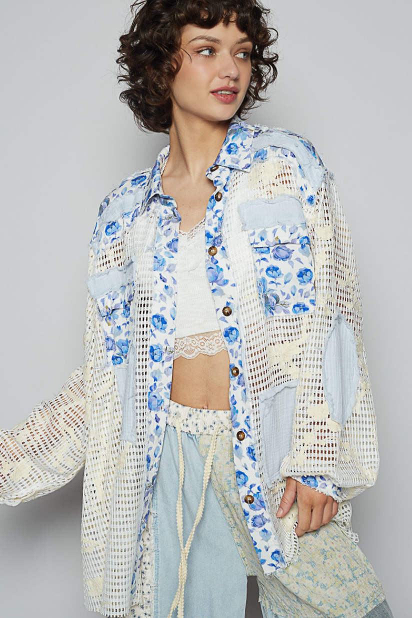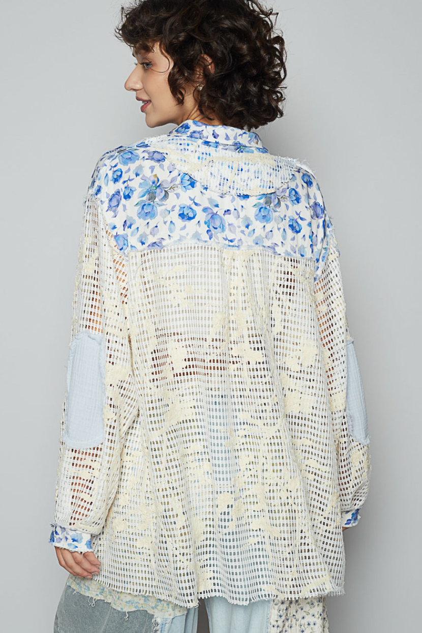 Designed in collar shirts, balloon sleeve, relaxed fit top in crochet lace with raw edge detail pointed floral pattern. With a lightweight material, this shirt is great as a layering piece on a cooler summer day.