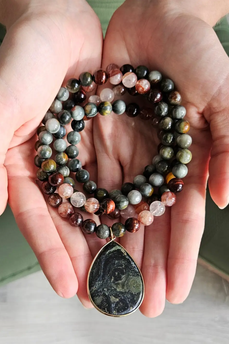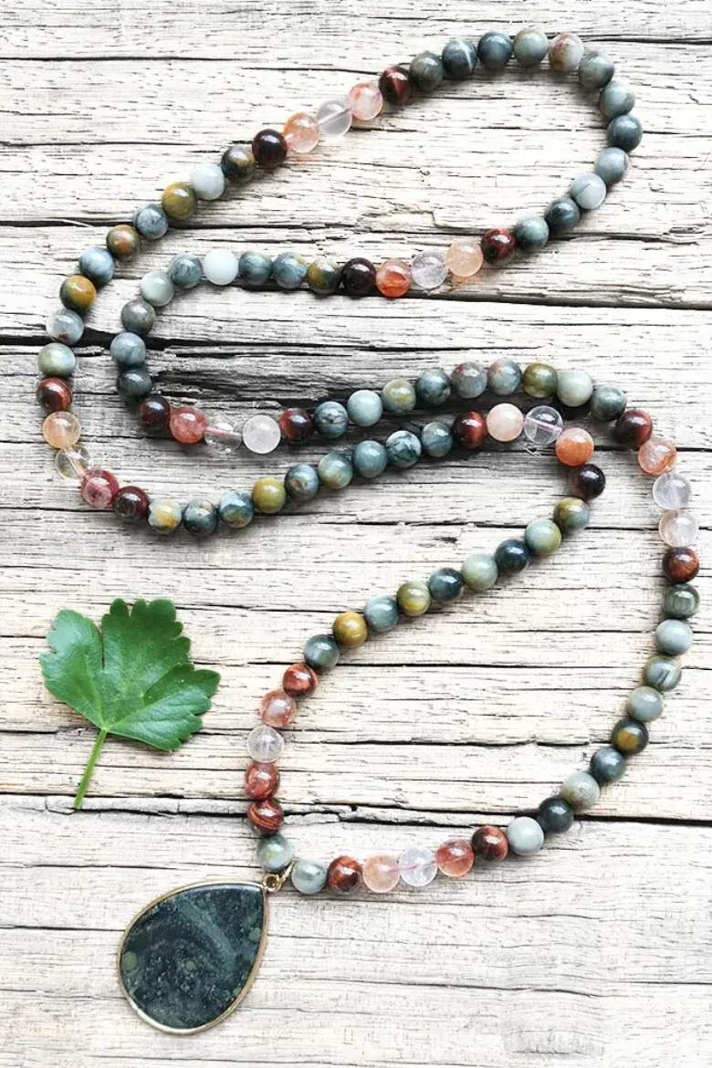 Discover strength and clarity with our stunning 108 Mala Bead Necklace, carefully crafted from Red Tiger Eye, Fire Quartz, and Green Eagle Eye beads, complete with a striking Green Jasper pendant. This gemstone mala bead necklace serves as both a spiritual tool for meditation and a source of focus and renewed energy.