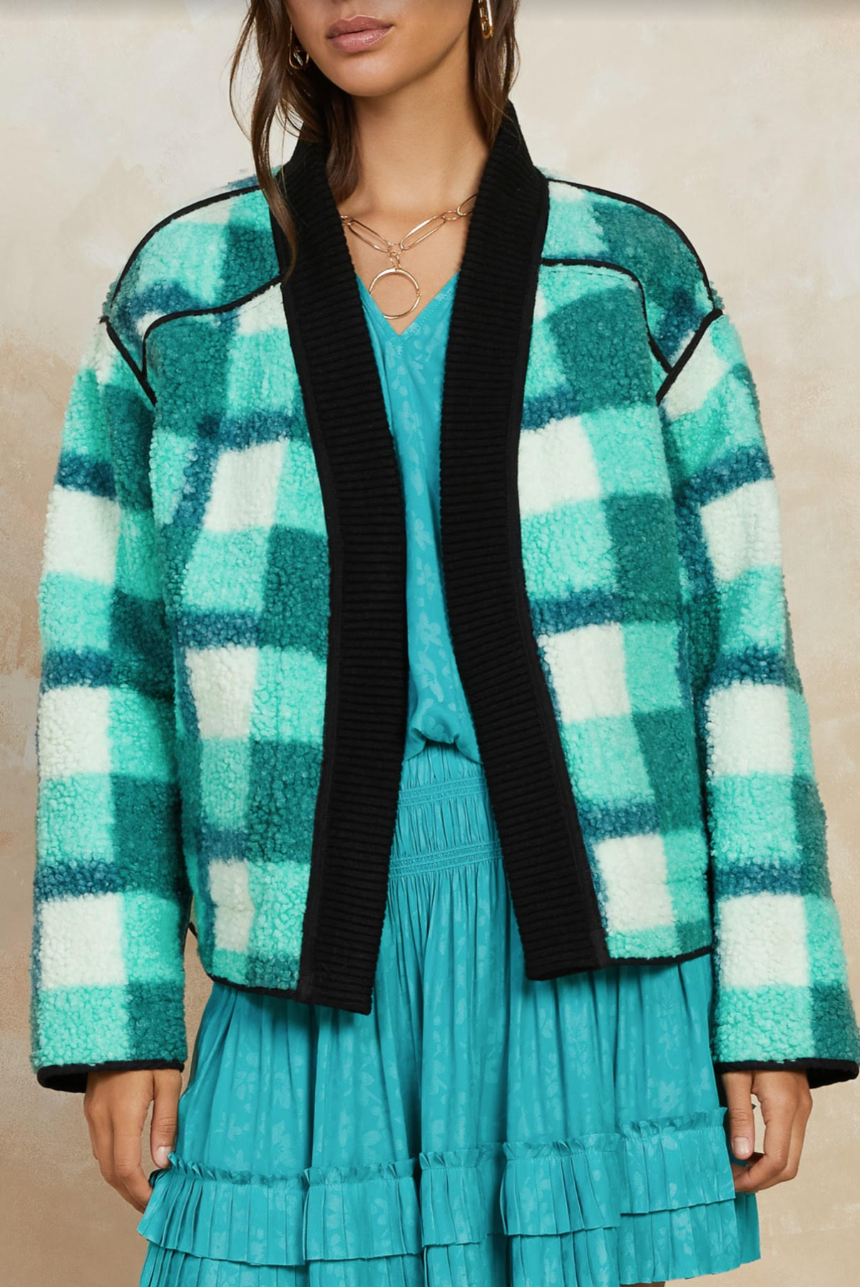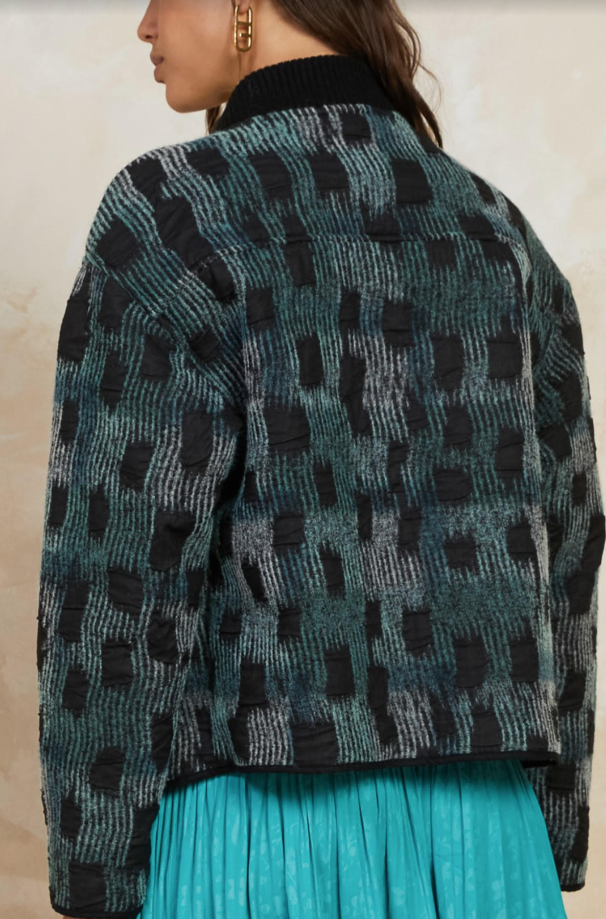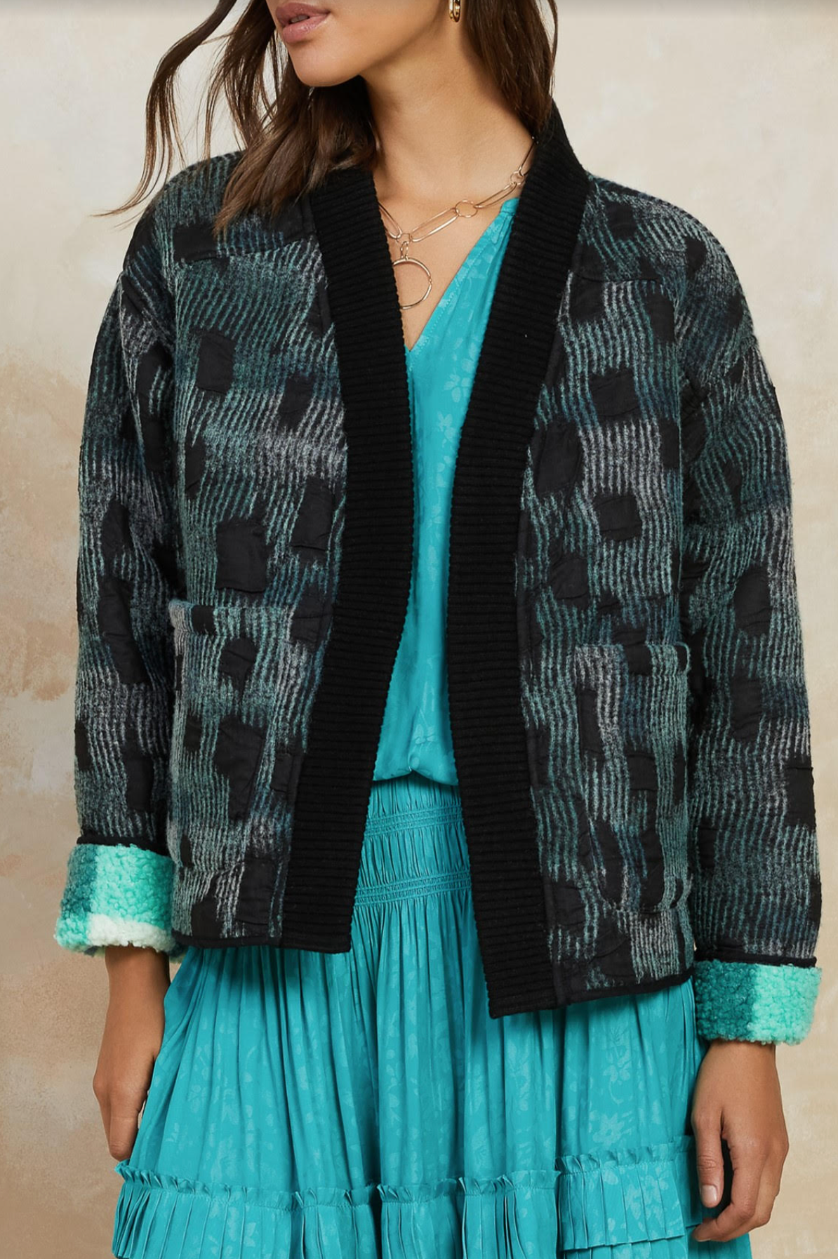 This jacket is REVERSIBLE. The aqua color is a perfect pop of color and you can wear it to anything!