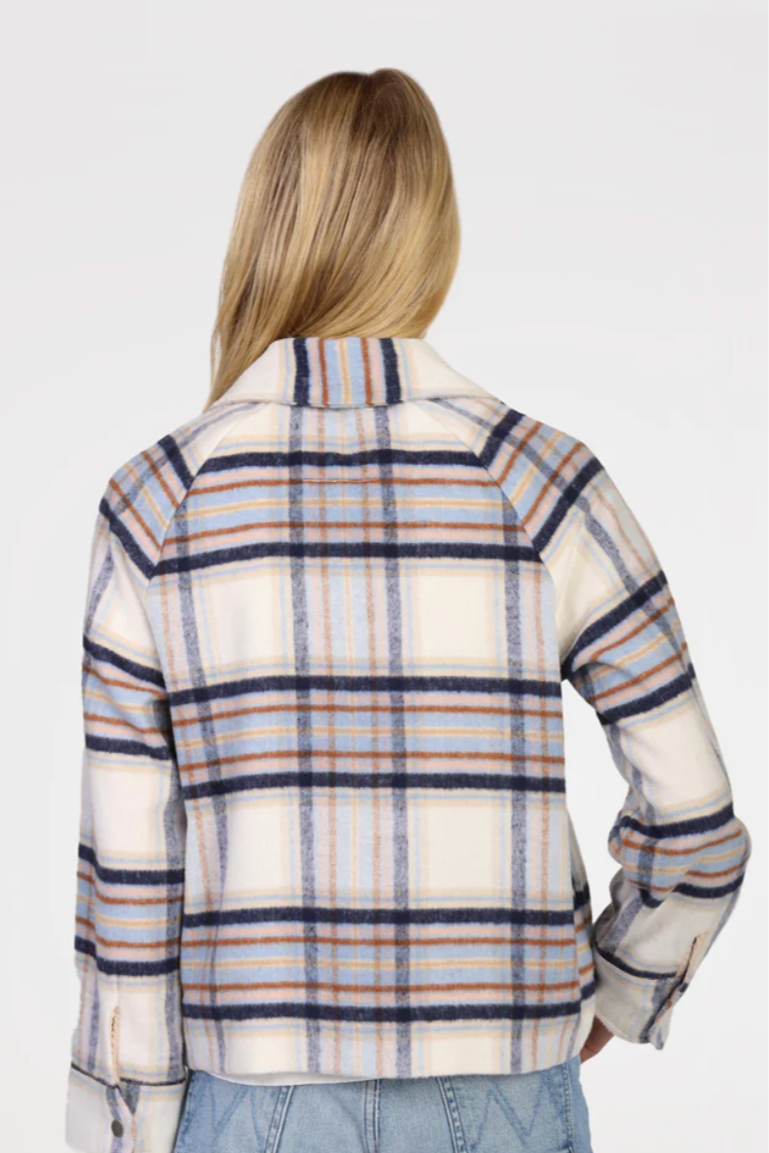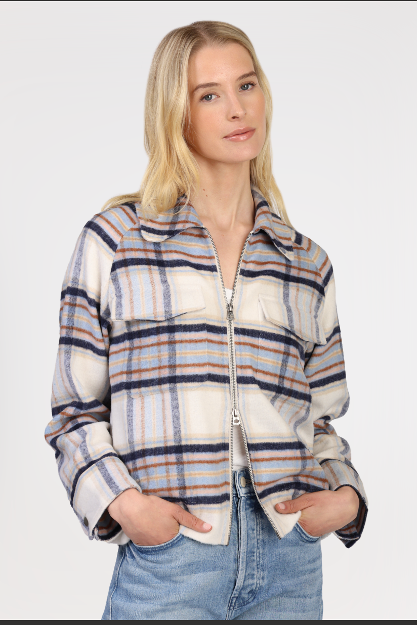 Fall plaid zip jacket in navy,, blush and ivory. Zipper is adjustable from both ends.