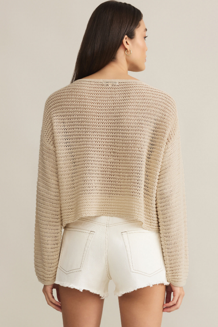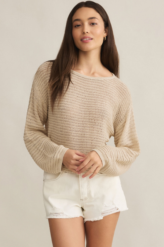 The Riviera Crochet Top is a great vacation piece to wear during breezier evenings. This top features a boat neckline, cropped length, a midweight material, and has a regular fit.