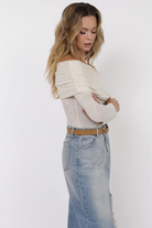 Off the shoulder look can be dressed up or down. The jacquard print gives it an edge. Pair with jeans.