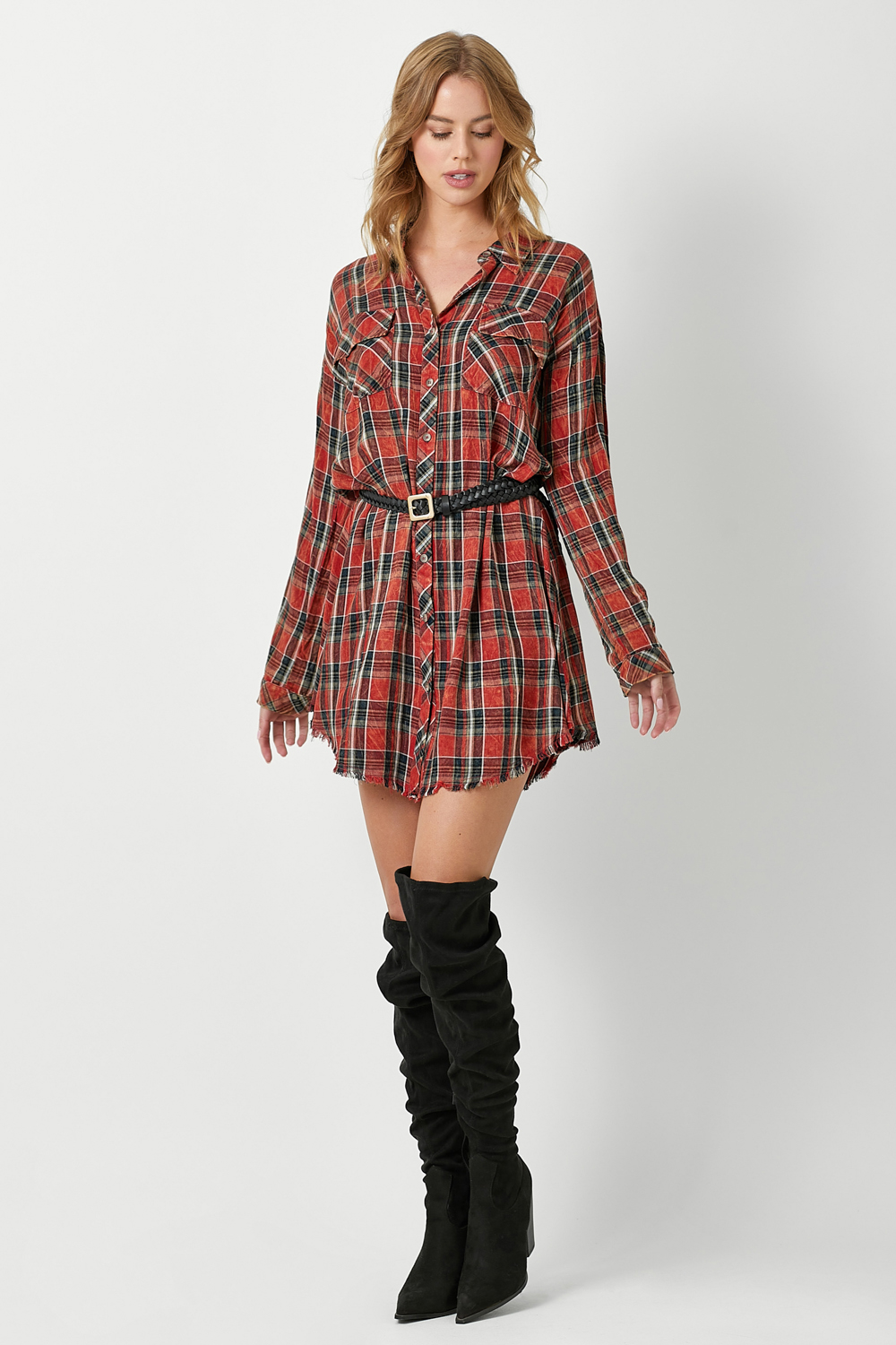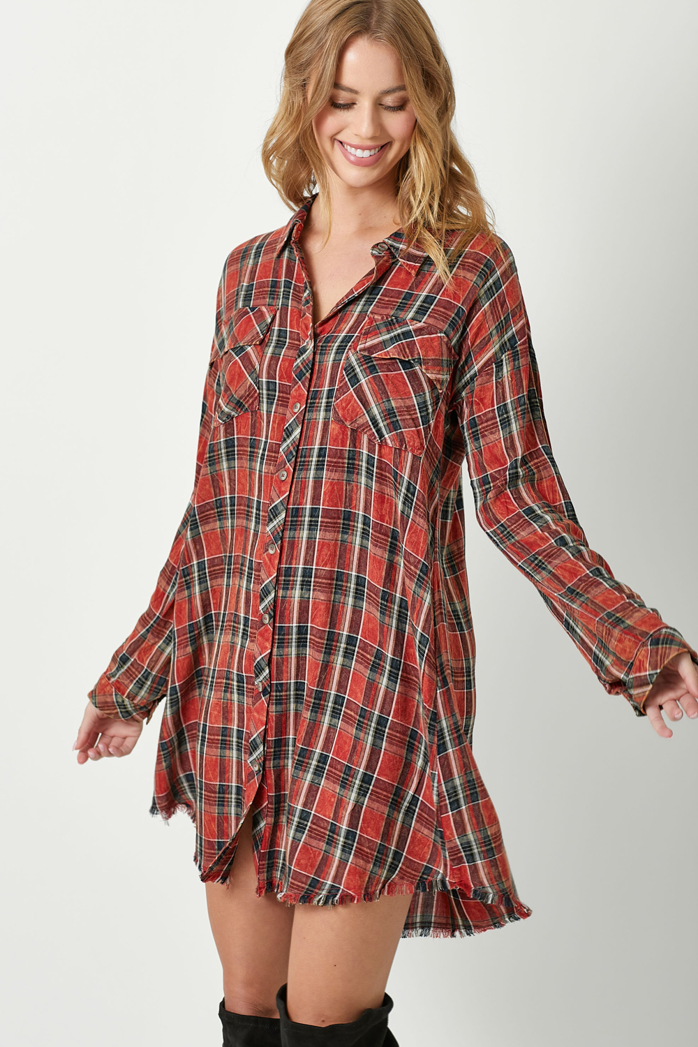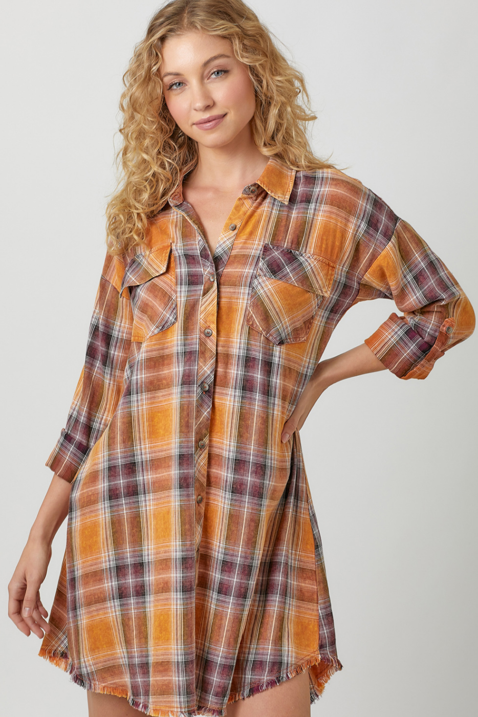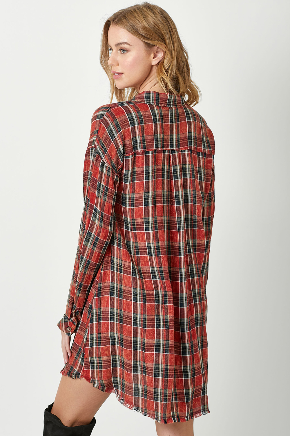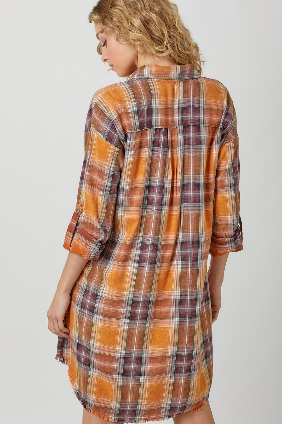 Rolled Up Sleeve Washed Plaid Shirt Dress