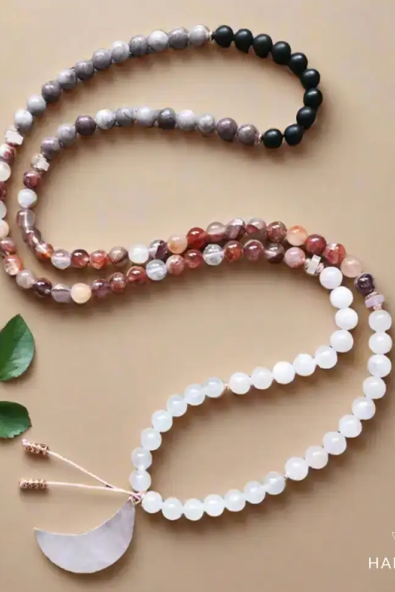 Handcrafted with 108 beads of natural Rose Quartz, Black Onyx, Fire Quartz, White Stone, and Purple Stone, this mala necklace promotes love and protection. Featuring a Rose Quartz moon pendant, it enhances emotional healing and compassion. Rose Quartz fosters love, Black Onyx provides grounding and protection, Fire Quartz energizes, White Stone supports clarity, and Purple Stone aids spiritual growth. Perfect for daily wear or meditation, this necklace measures around 91cm.