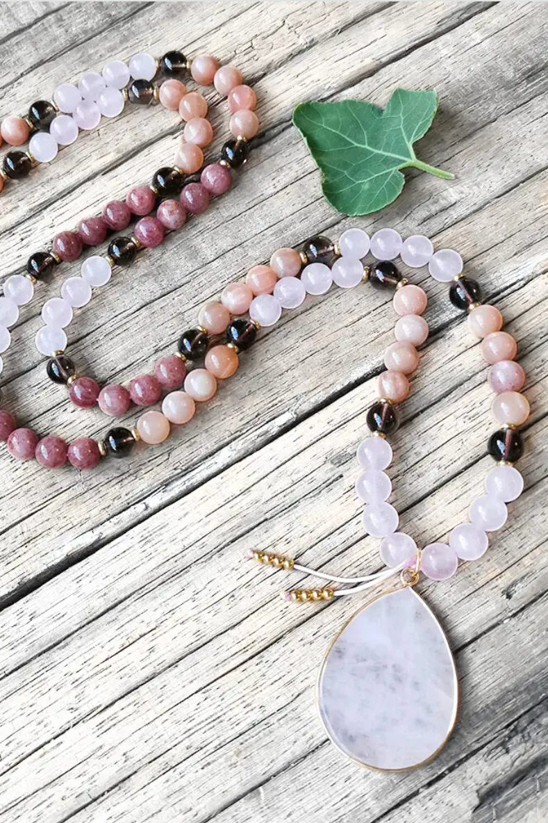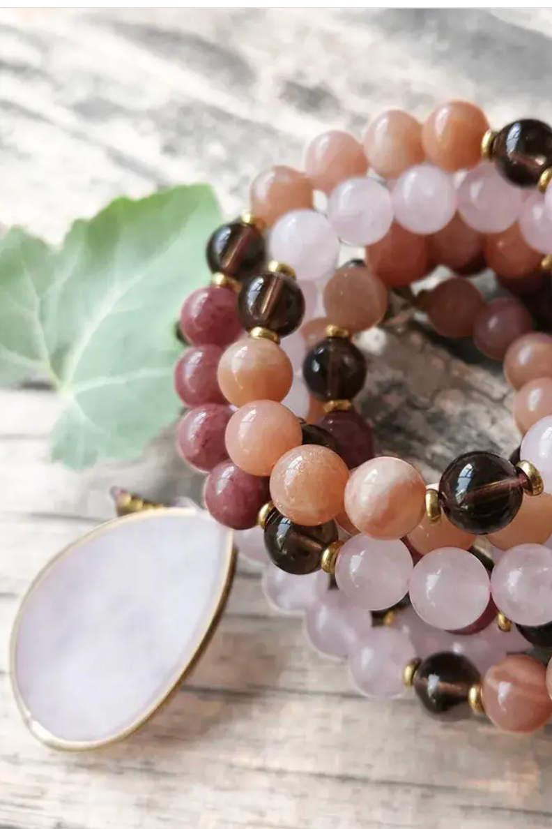 Rose Quartz, Sunstone, Strawberry Quartz & Smoky Quartz Mala Necklace