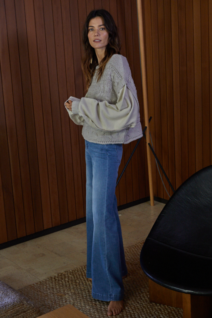 Round neck knit sweater with contrasting sleeves, pair with jeans and low boots. Model wearing size small.
