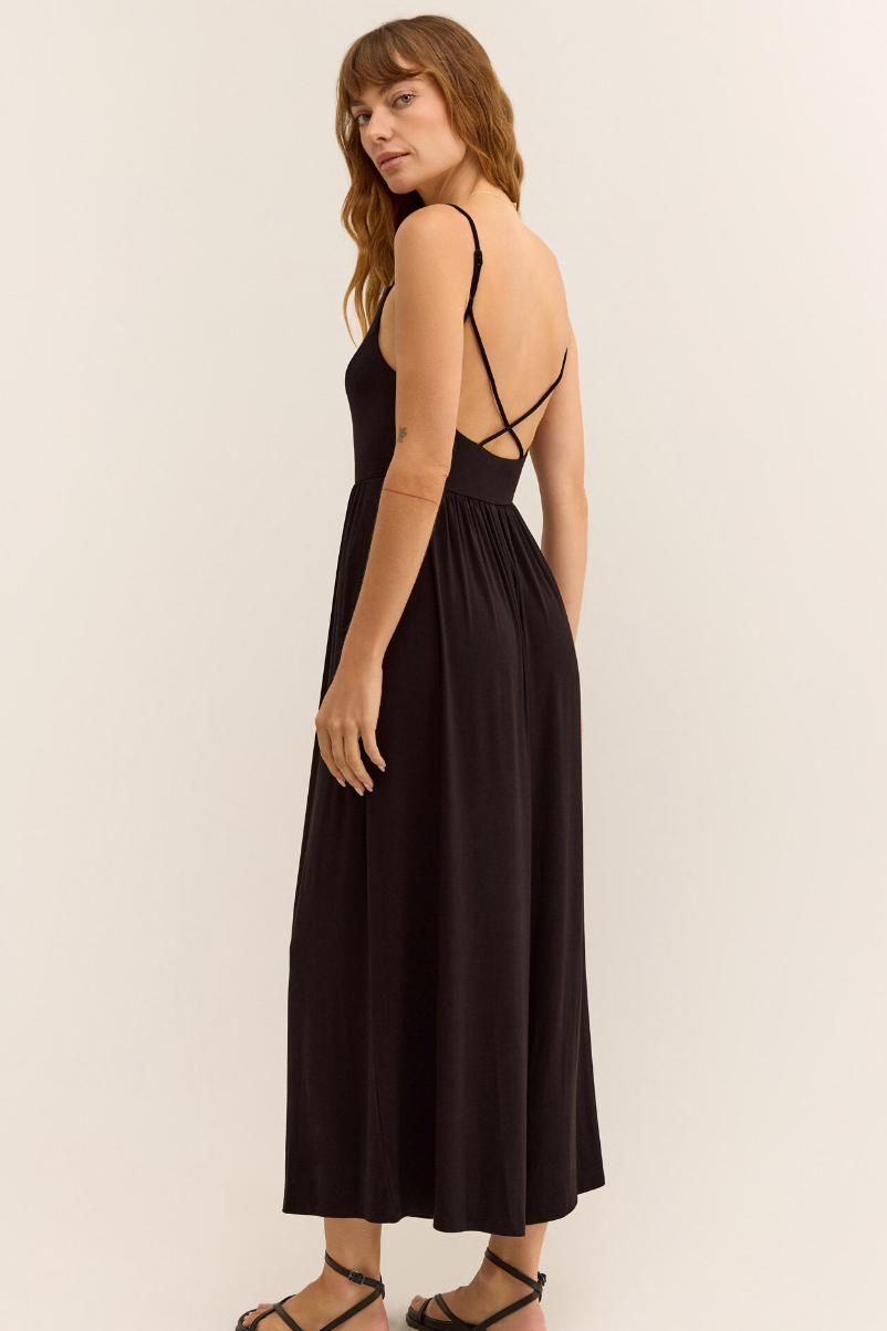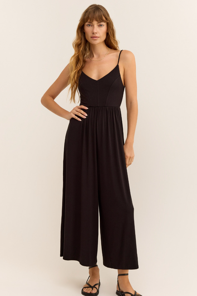 The perfect item to wear this summer! The Roz Jumpsuit has a flowing wide leg pant, making it easy to move around in, as well as a fitted bodice and criss cross straps.
