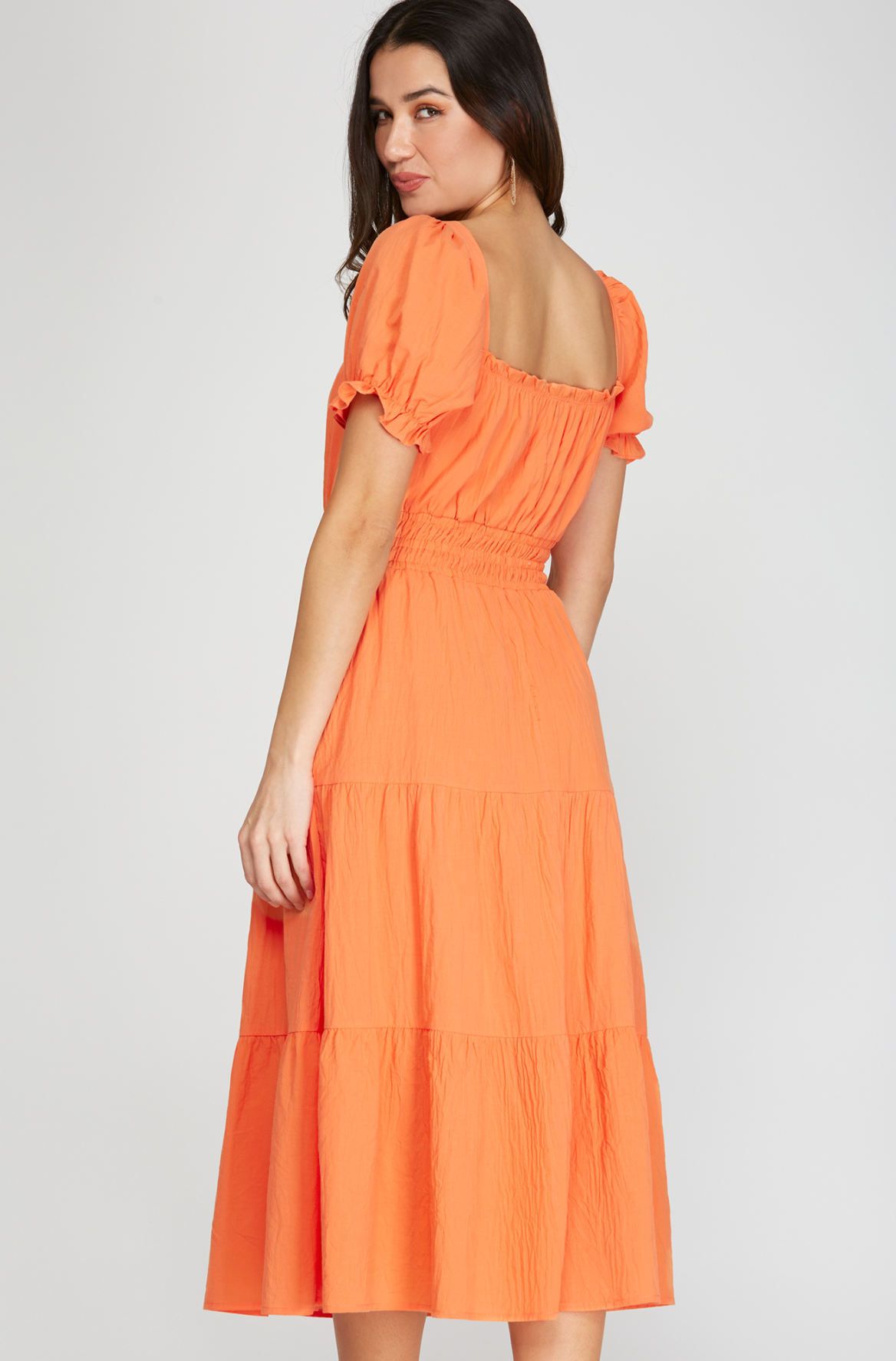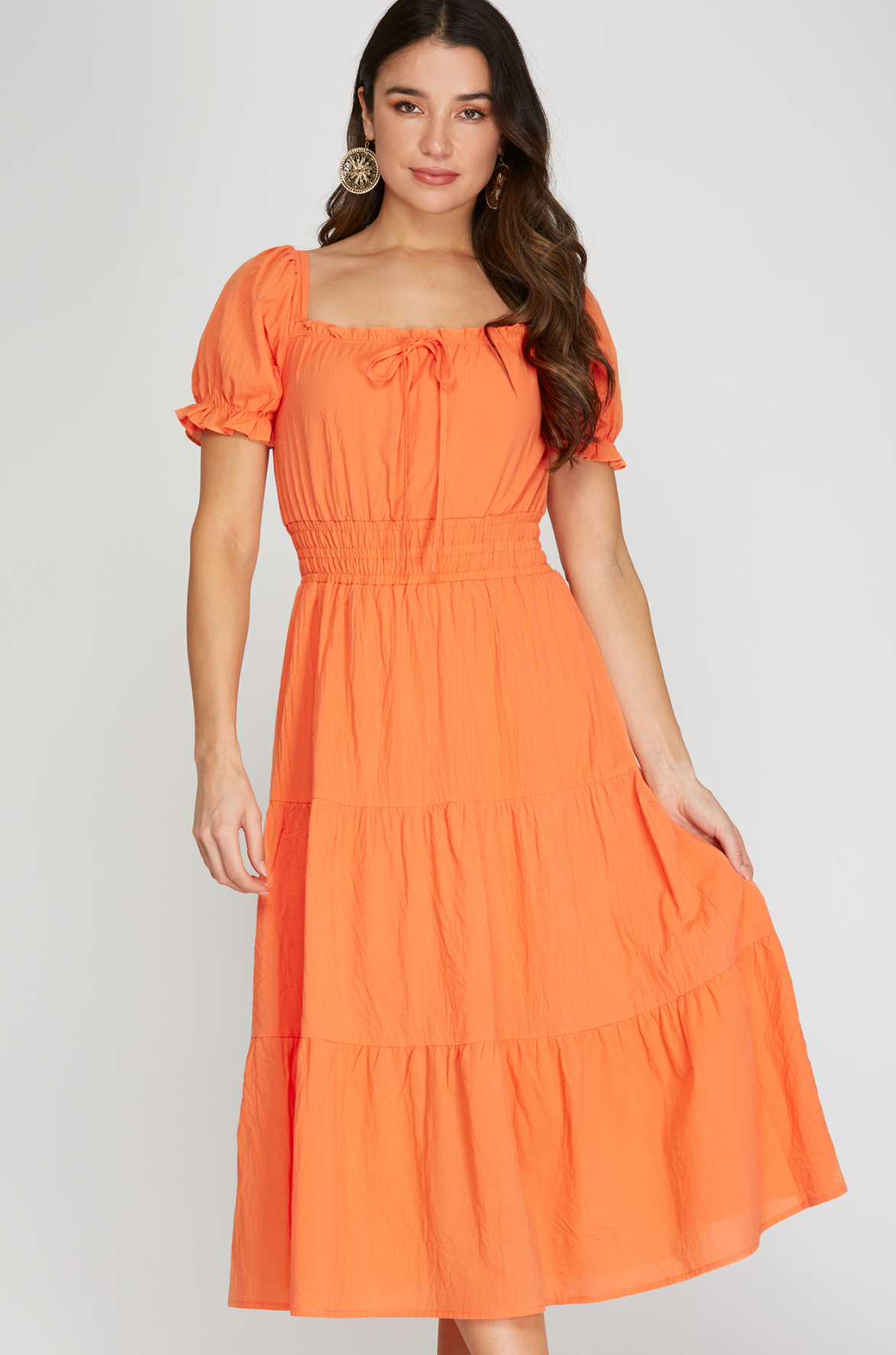 This tangerine midi dress is a great pop of color. This dress is easy to wear for any occasion and is bra friendly.