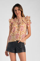 A patterned short sleeve top for the warm weather! This could look great as a casual outfit paired with jeans.