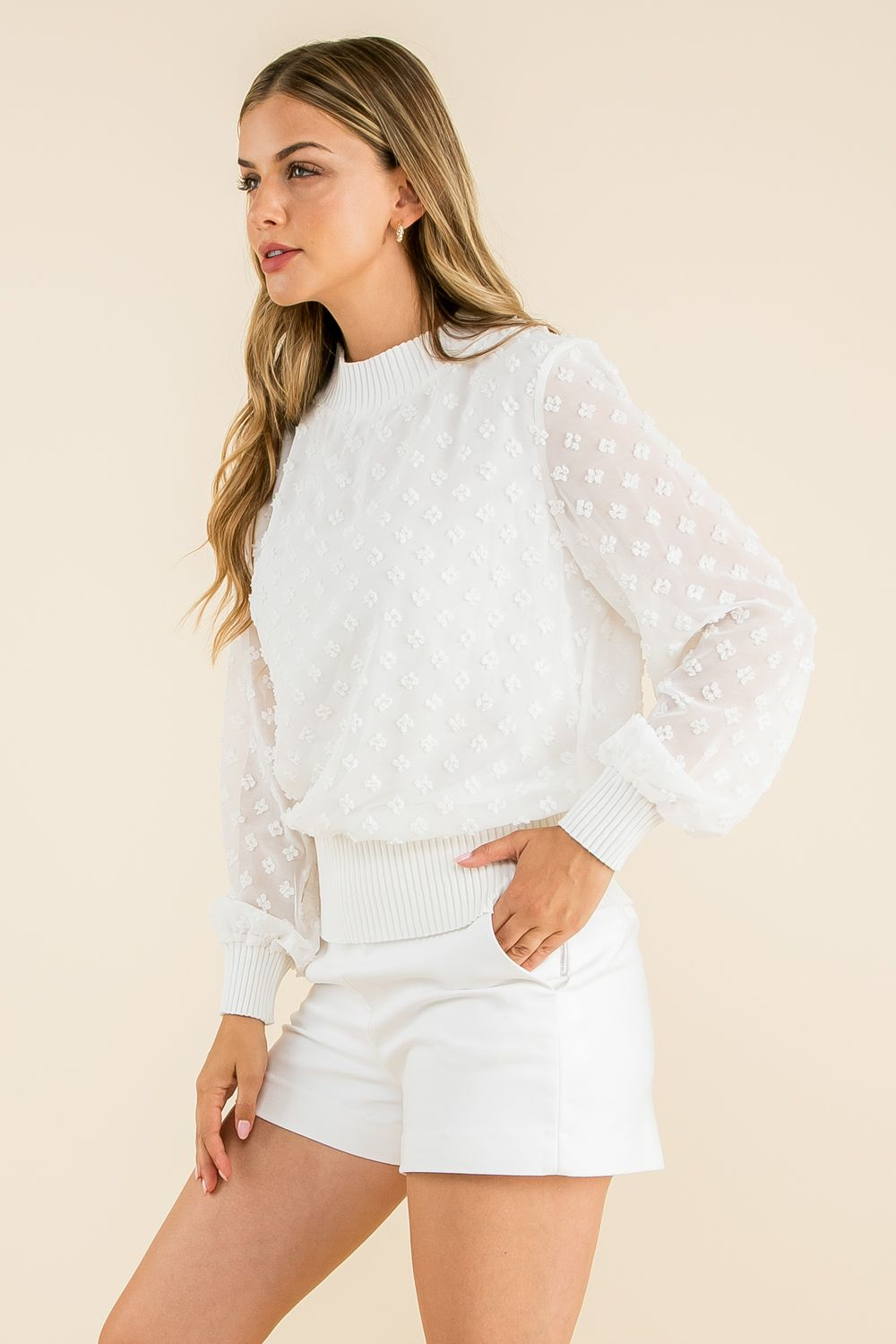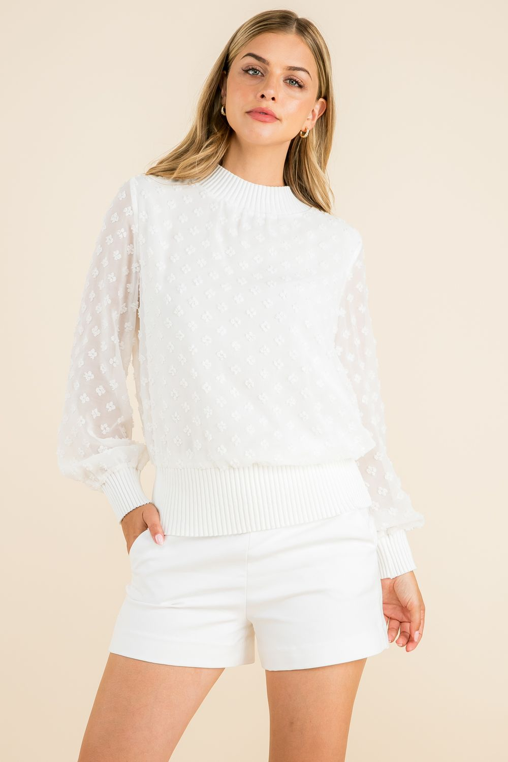 This long sleeve blouse has a pom texture on the body and sleeves. There is an elastic feature around the wait, neck, and wrists. This makes it easy to wear tucked in and under a winter coat.