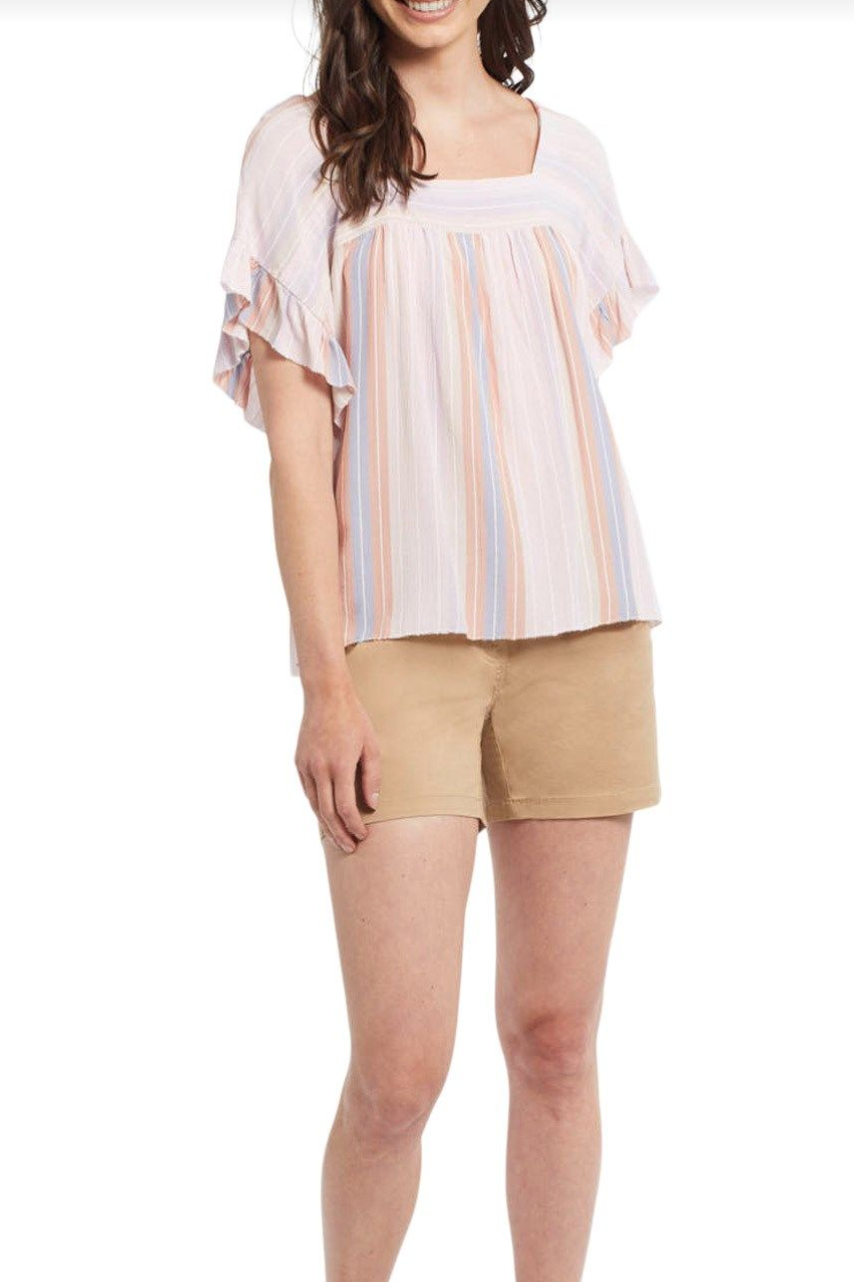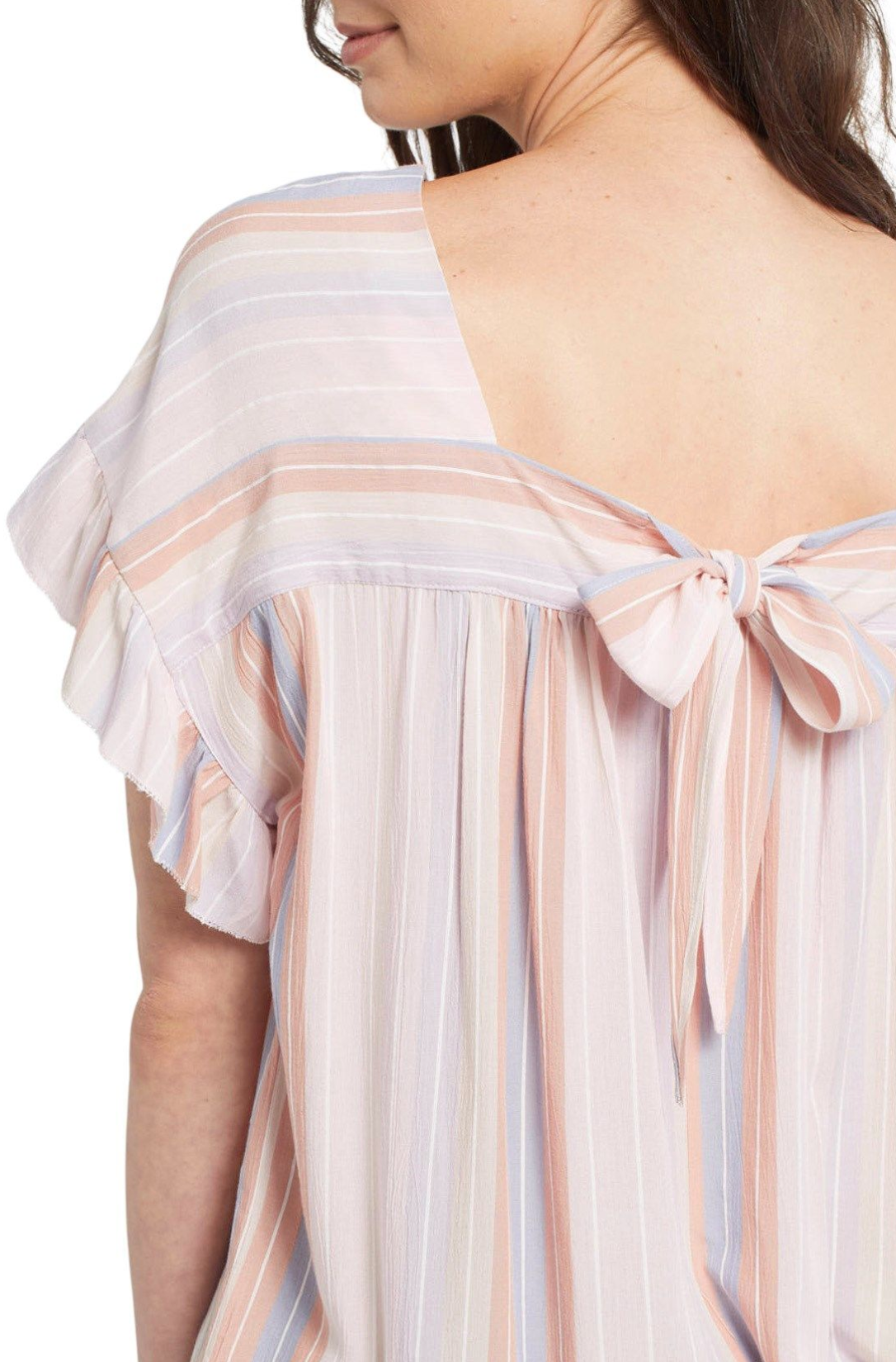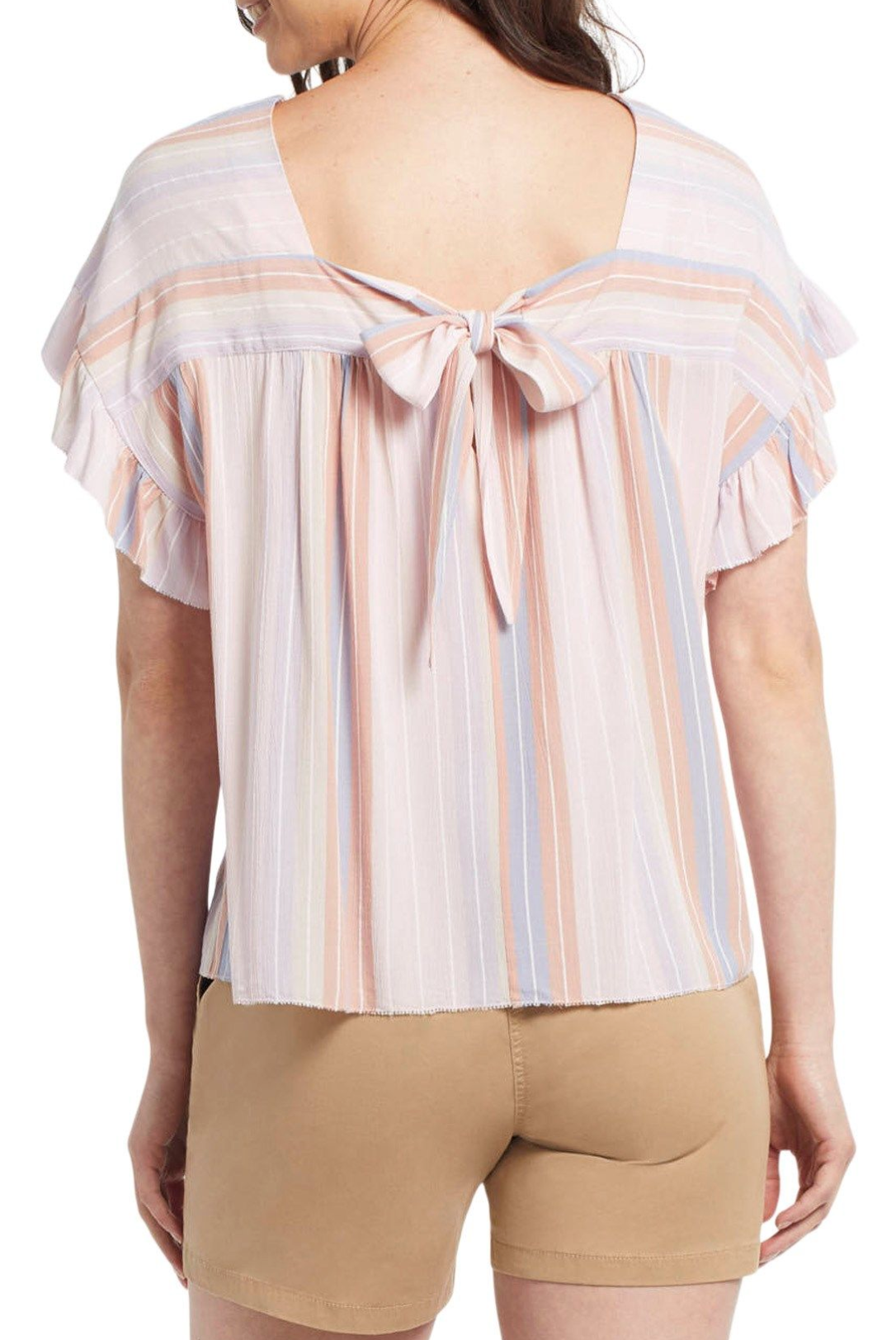 This ruffle sleeve blouse has a tie-back detail. Looks great with medium/dark wash jeans and summer wedges for a date night!