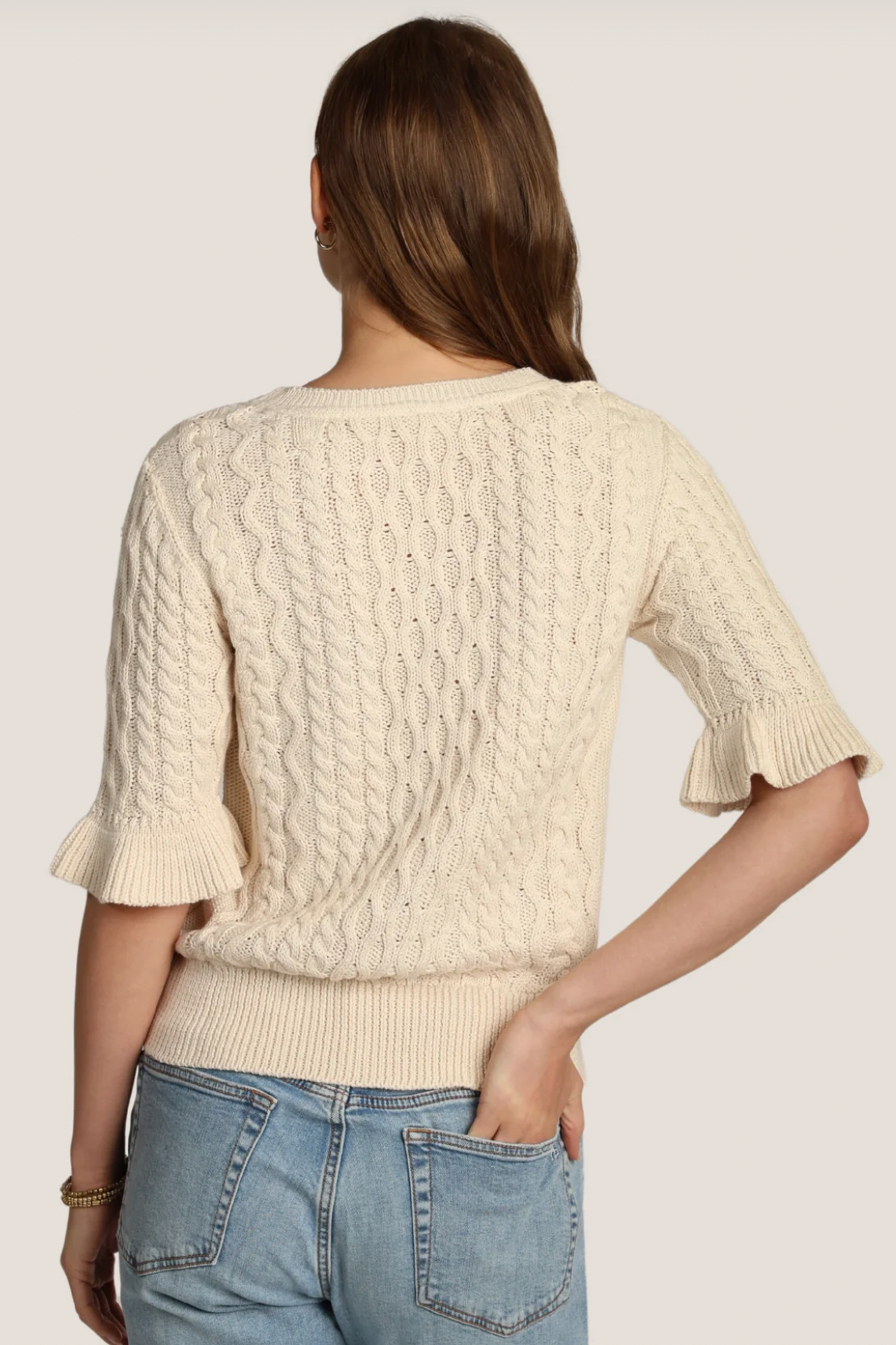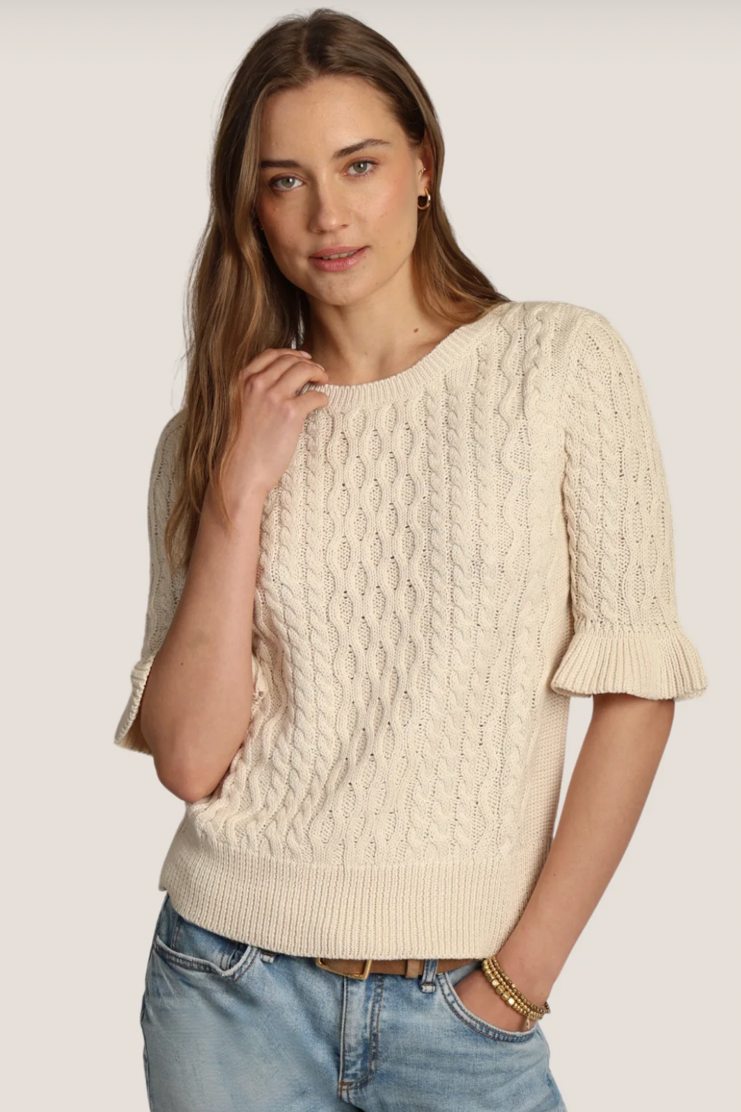 The charming Ruffle Sleeve Crew Top is the perfect addition to your outfit for an elevated casual look! Featuring cable knit detailing and a ruffled hem sleeve for an elegant touch. Pair with your favorite pant and shoe to complete the look!