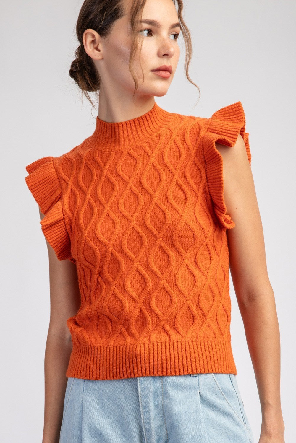This short sleeve sweater top is a versatile piece. The Ruffle Sleeve Textured Sweater can be worn on its own or can be a layering piece with a long sleeve underneath. This sweater features ribbed sleeves and neckline, and has a fitted silhouette.