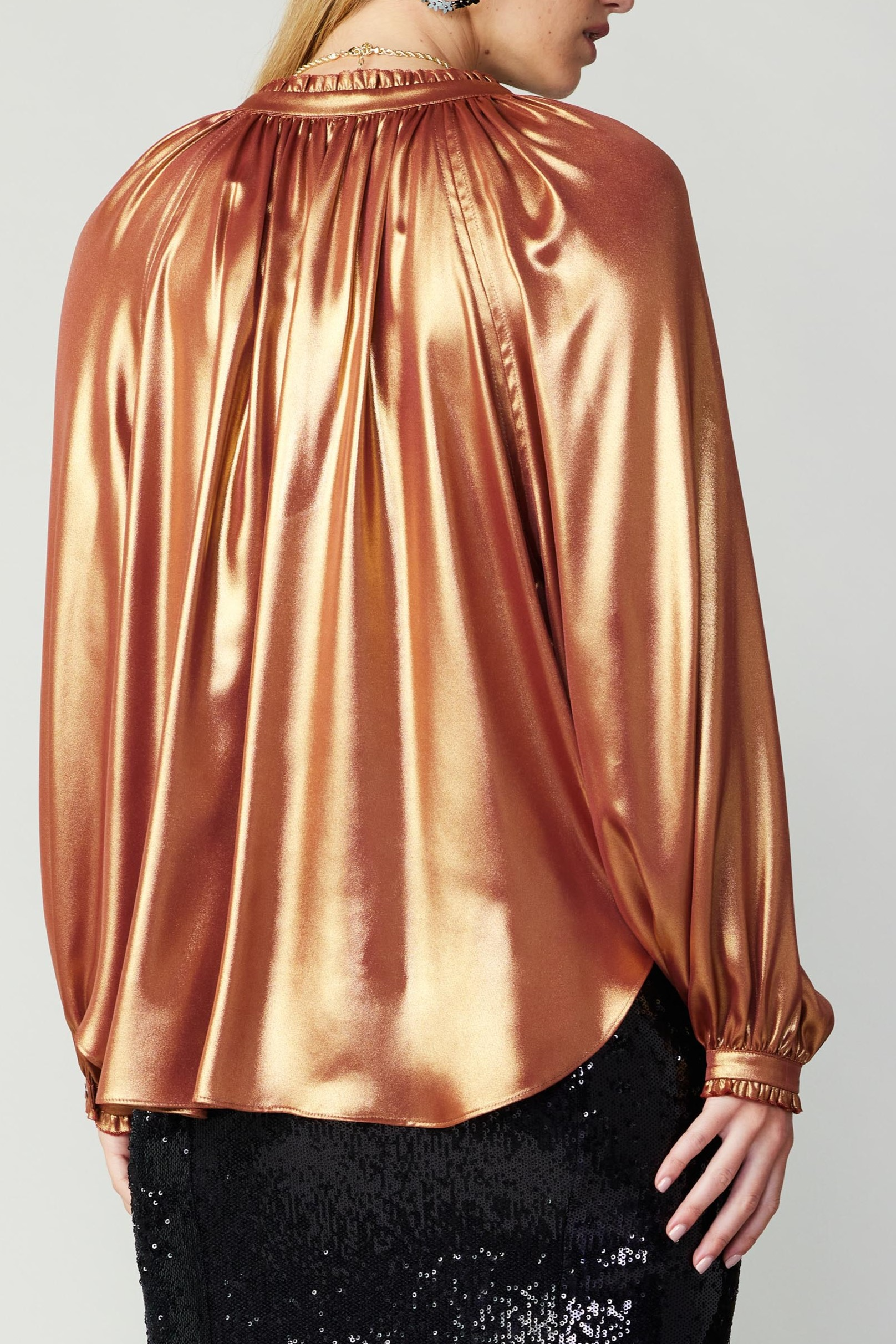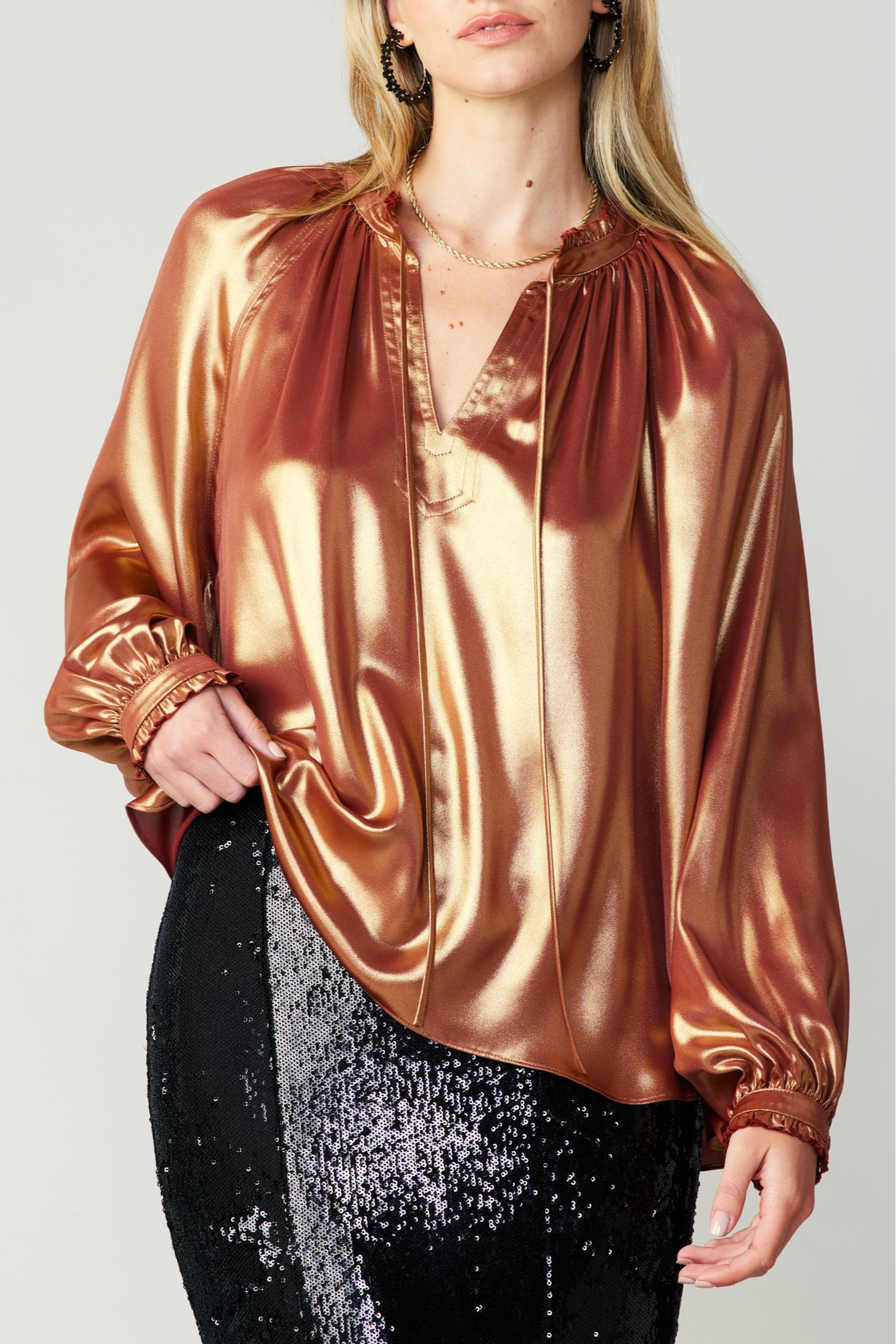 This blouse has a relaxed fit, making it flowy and lightweight to wear. The shiny rust color of this blouse will make you stand out, and is perfect for the fall season!