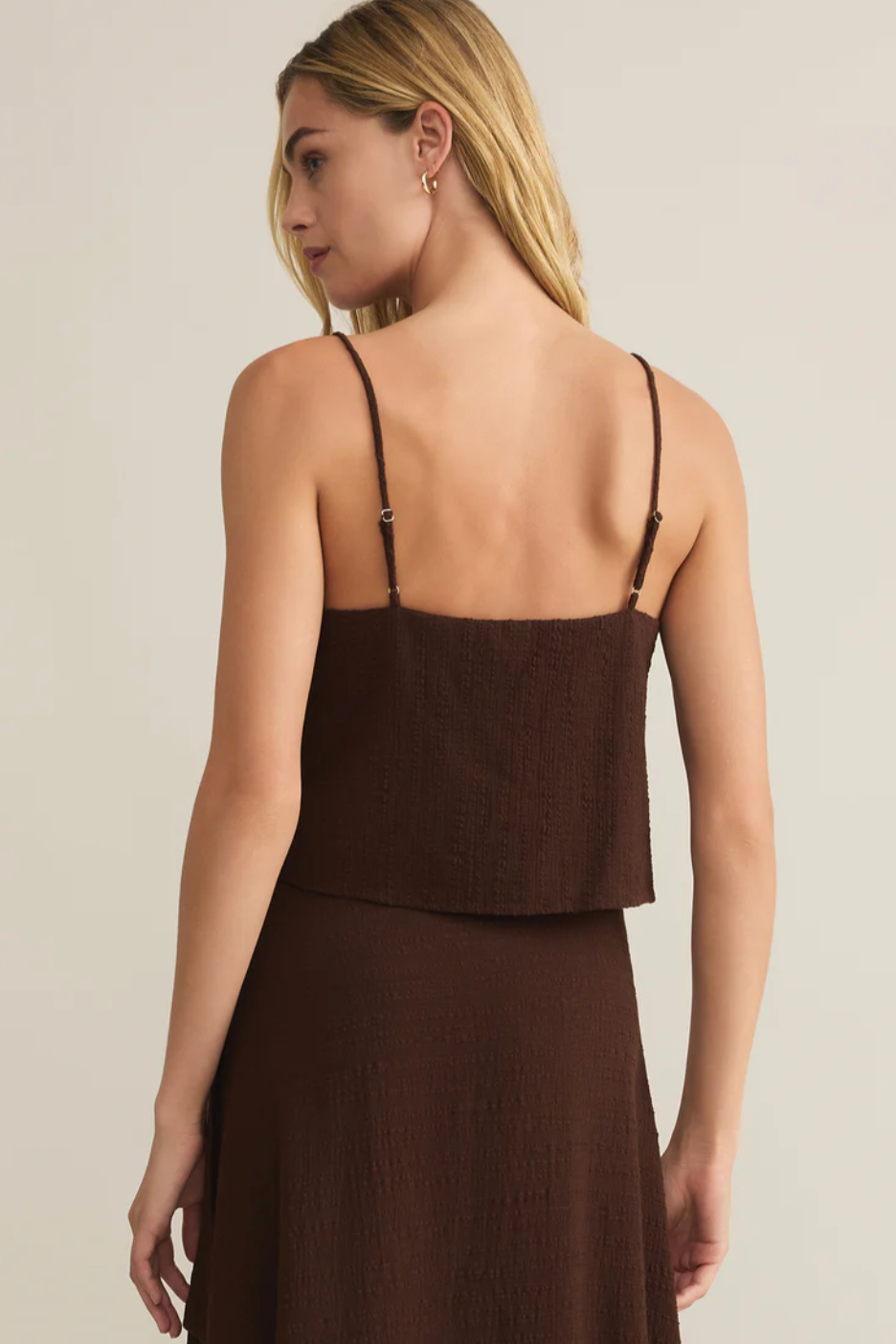 This breezy cropped tank, crafted from textured cotton, is all about easy vibes with its v-neckline, adjustable straps, and fringe hem detail. Perfect for sun-drenched days and layered looks alike.