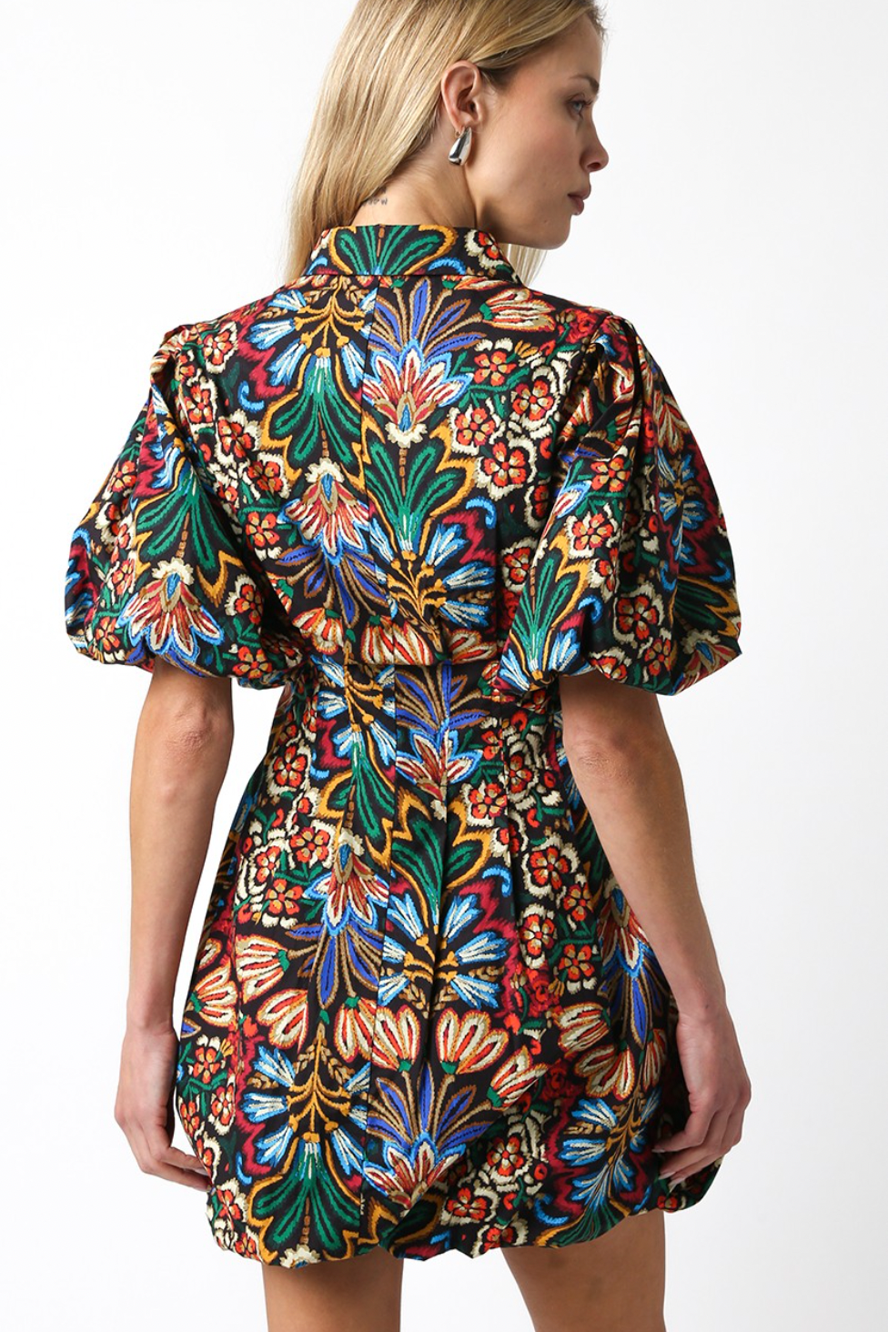 Our Sabrina Dress features a half way button, bubble hem and a puff sleeves.