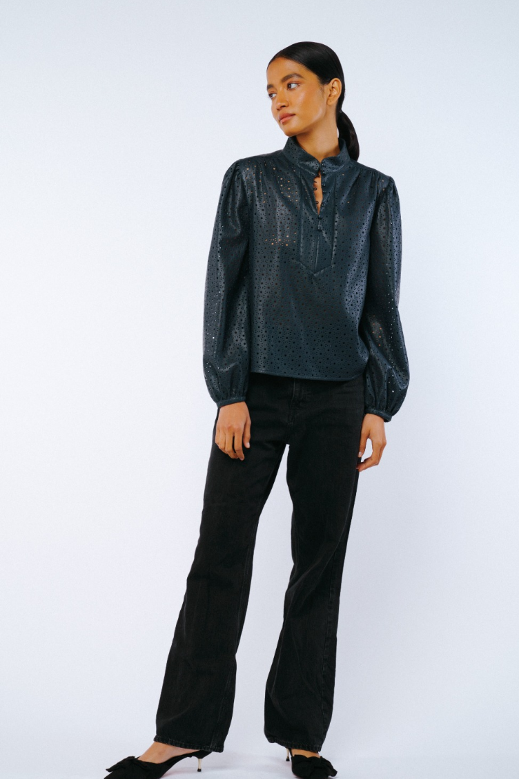 A statement top, this top can be paired with jeans or a vegan leather fitted skirt. Mock neck and detailed buttons. Puff sleeve. Stunning for a night out.