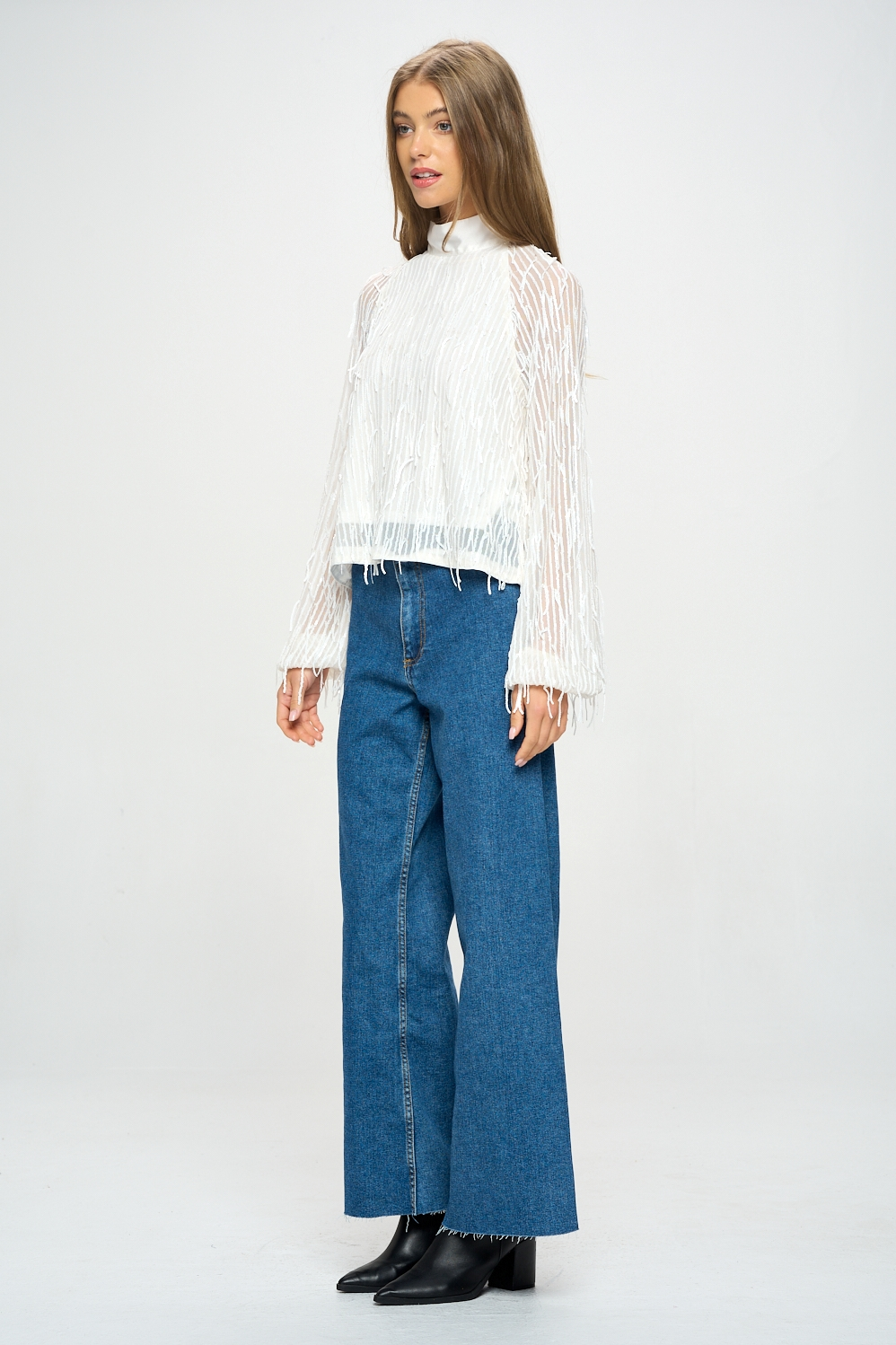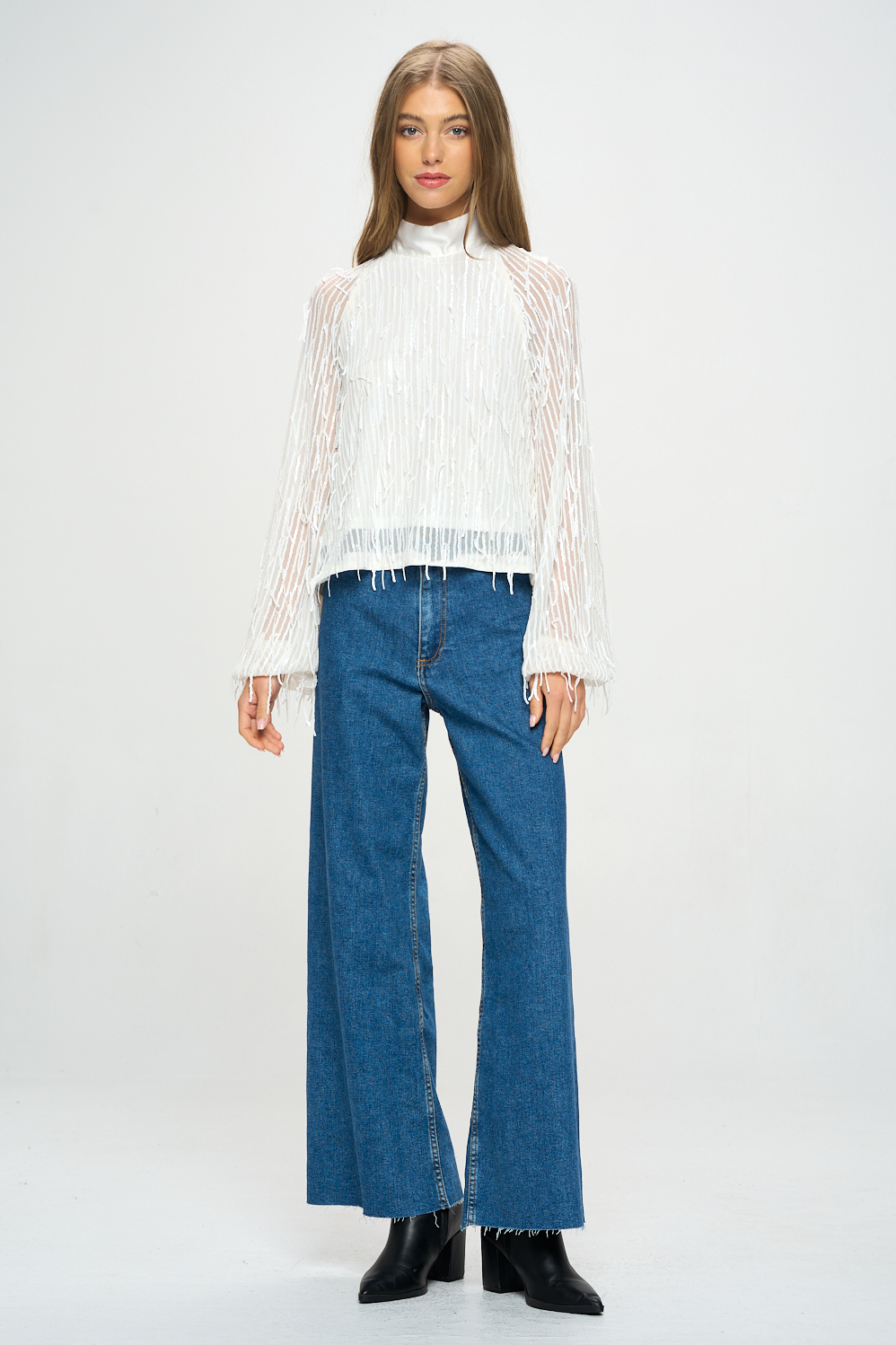 Sequin detail, mock neck. Tie back neckline with a peak a boo detail. Perfect for holiday or nights out. Pair with jeans.
