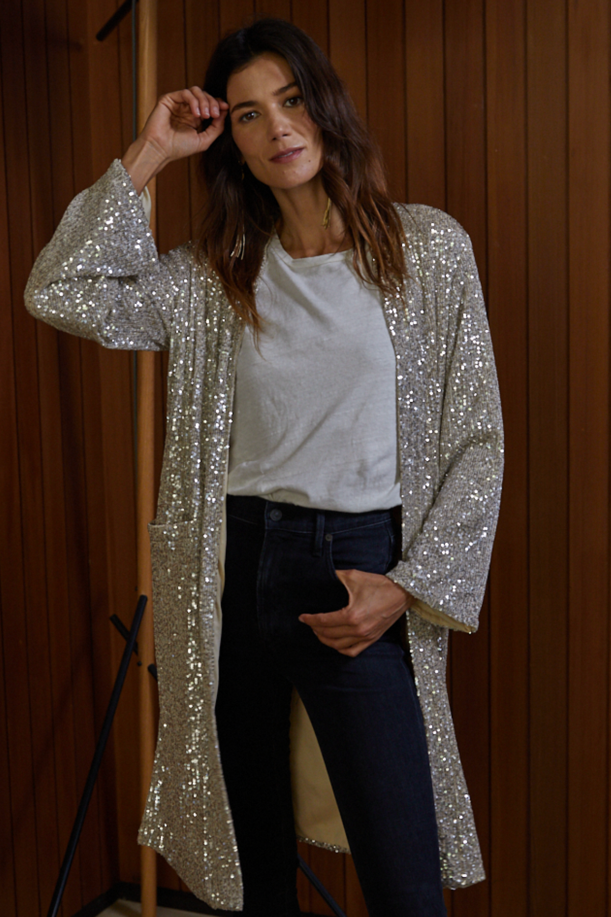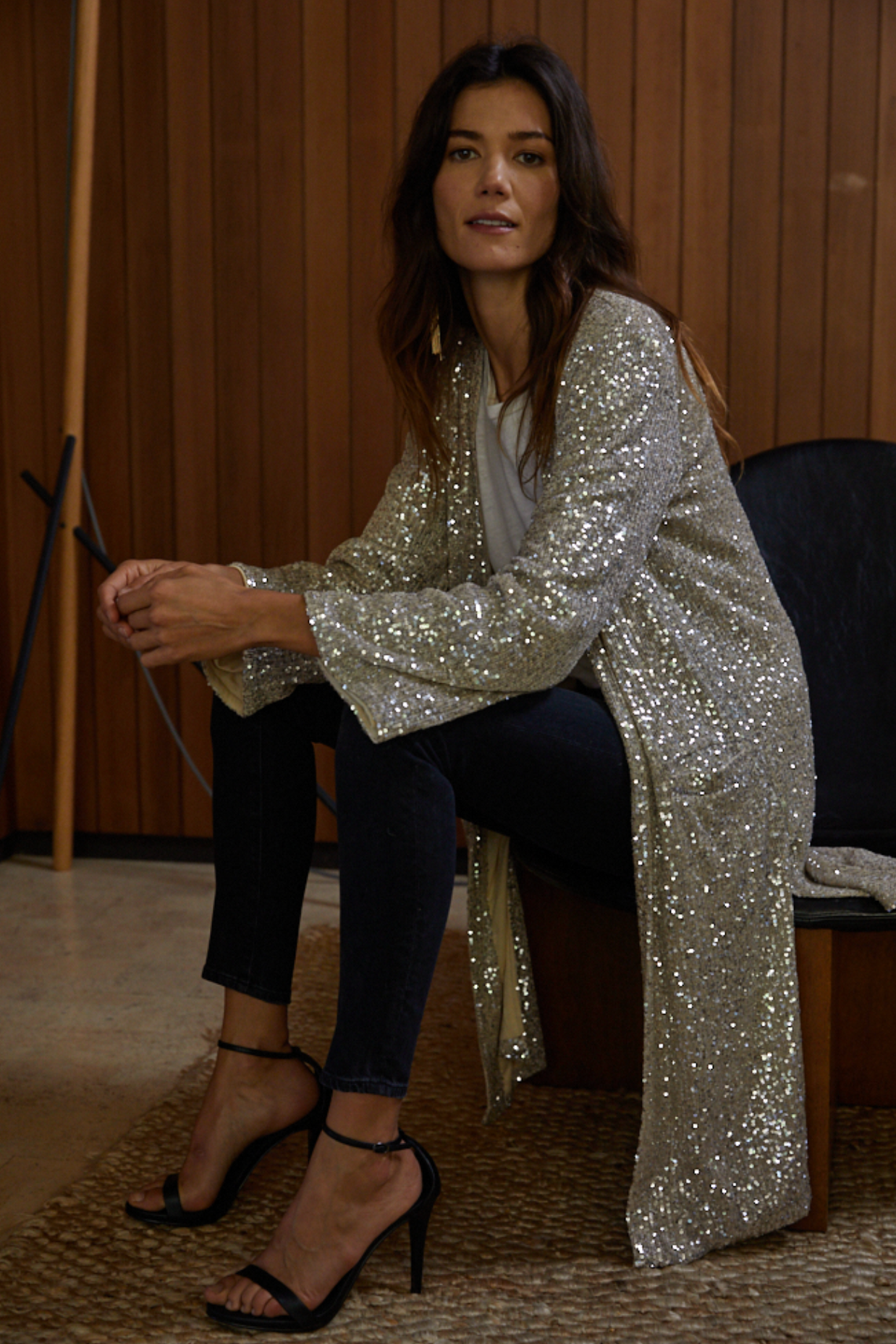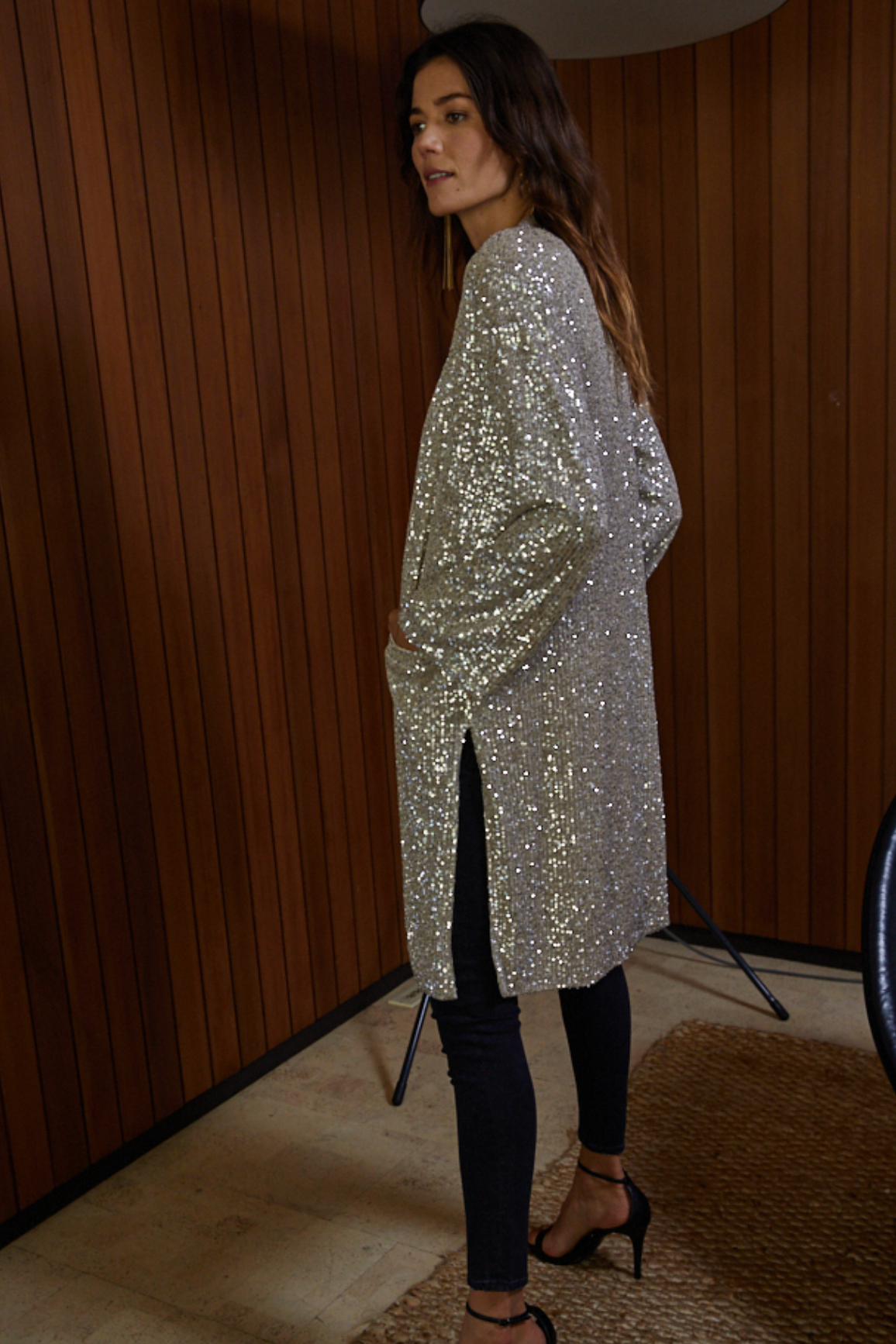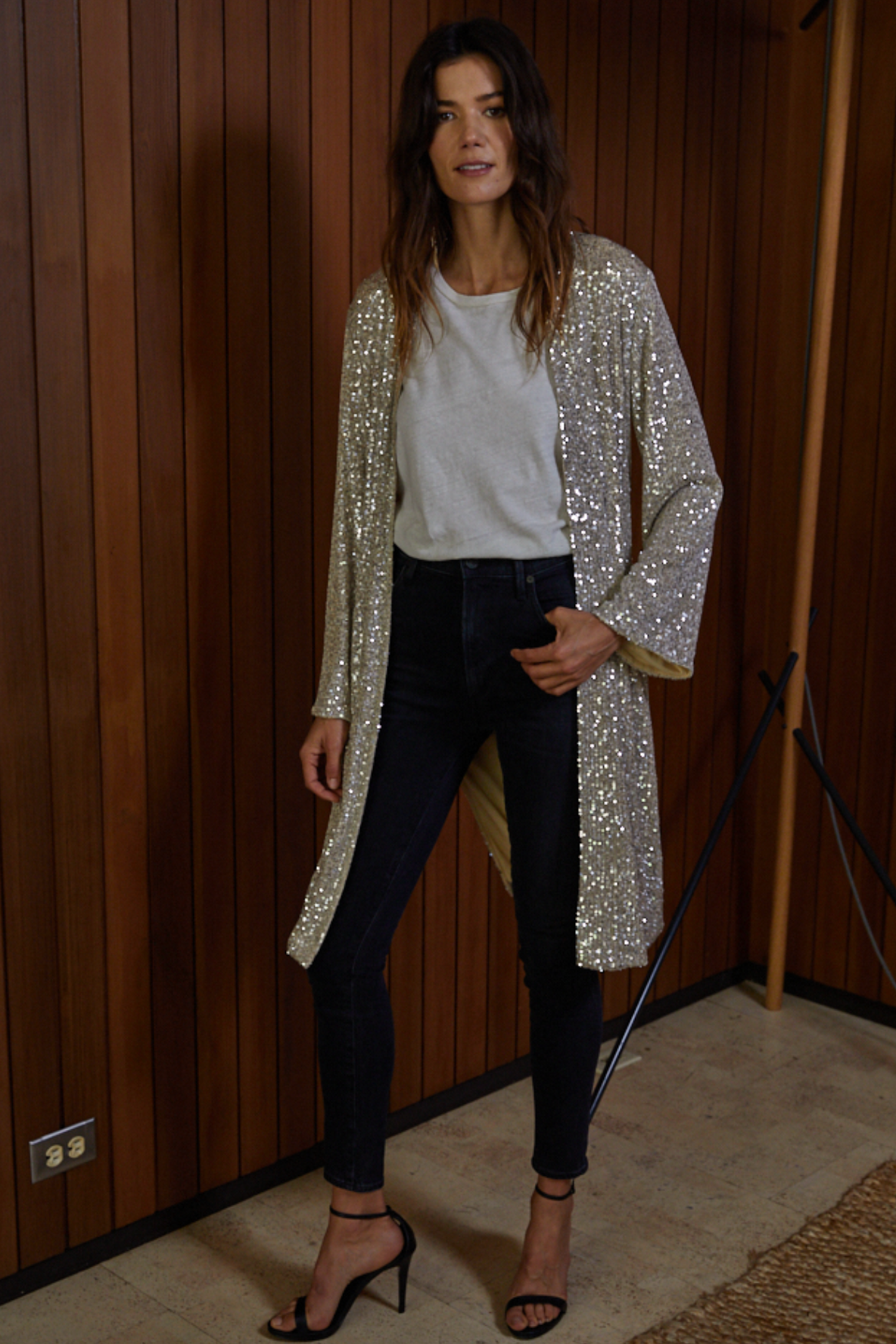 This sequin duster is great for the holiday season. The metallic gold duster makes dressing up for another holiday party so much easier.