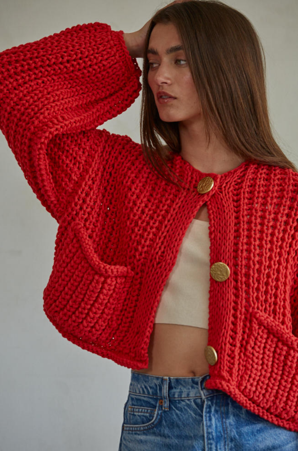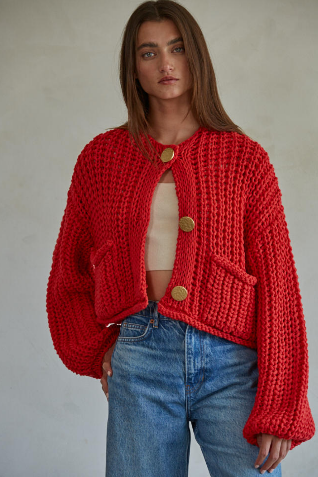 Knit Sweater Round Neck Button Down Long Sleeve Cardigan Top With Front Pockets. This chunky knit cardigan is just the sweater you need! Add to your cozy style this season with this cardigan.