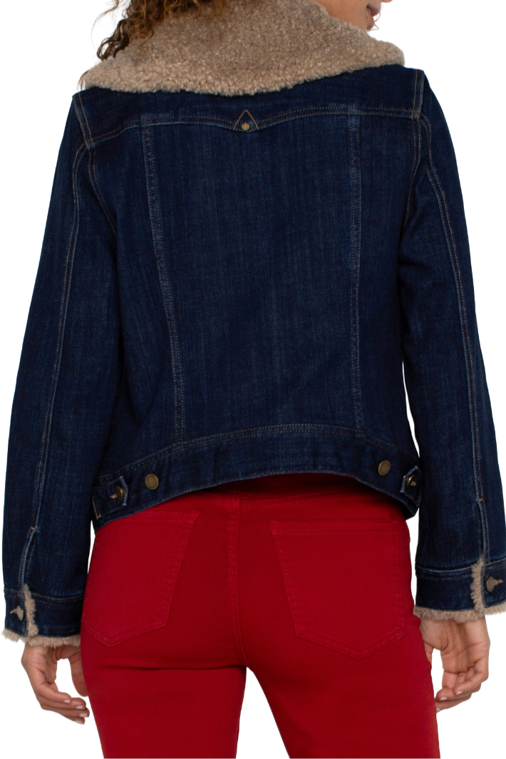 Dark blue denim trucker jacket with a generous sherpa collar and sleeve detail. Great, updated look for fall!