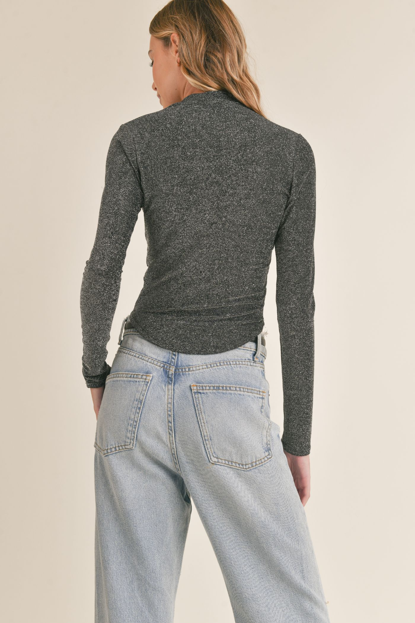 Add some sparkle to your outfit with this mock-neck top! The black silver color makes the top pair easily to any outfit. Can be dressed up with a skirt, or can be dressed down with jeans.