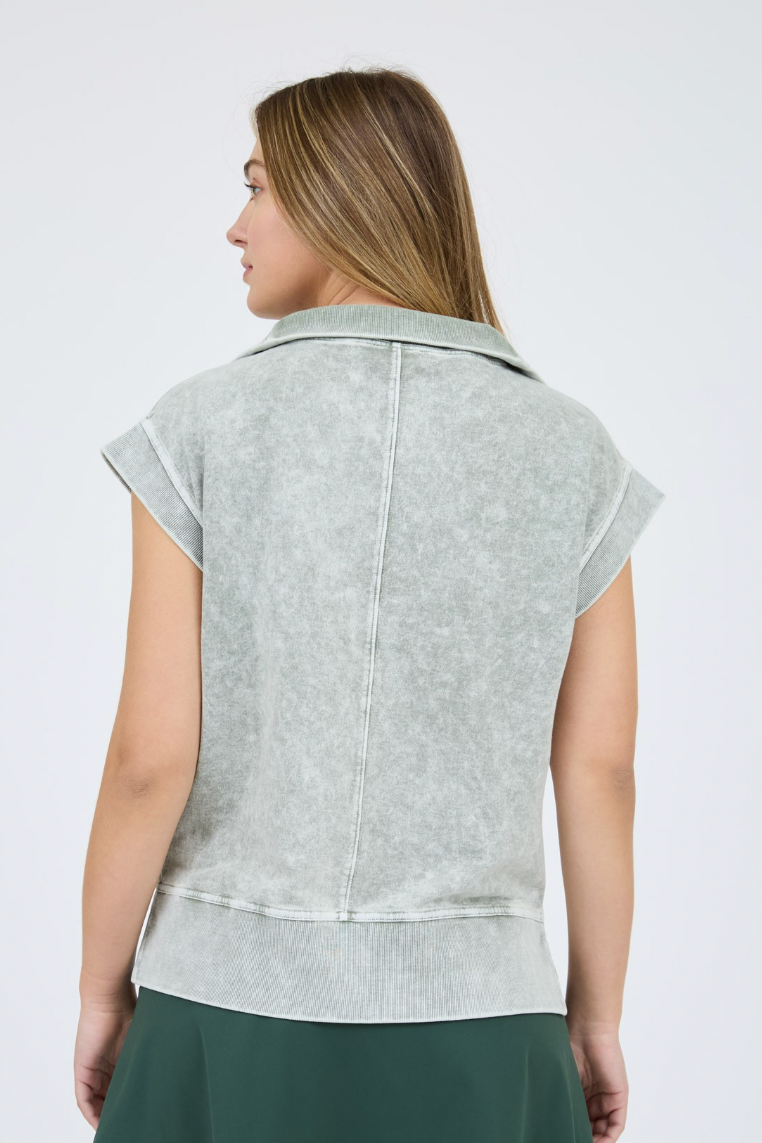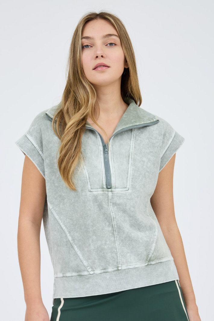 Washed Half Zip Ribbed Detail Sleeveless Knit Top