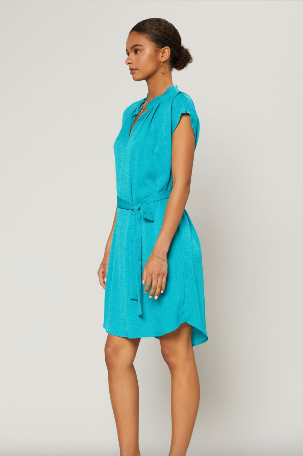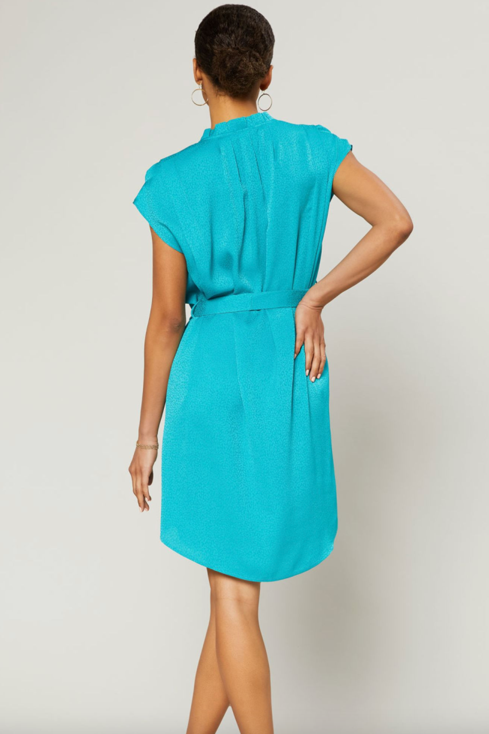 This dolman sleeve shift dress is a great pop of color. The turquoise color is beautiful! The dress can be worn with or without the tie.