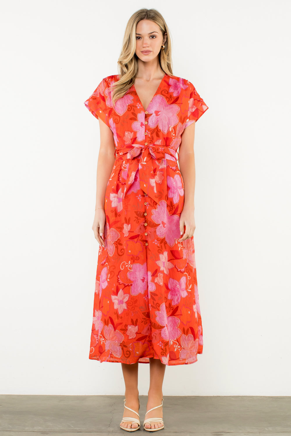 Figure shaping, this floral print dress has a belted waist line and a soft fabric flow. Pair with wedge shoes or sandals.