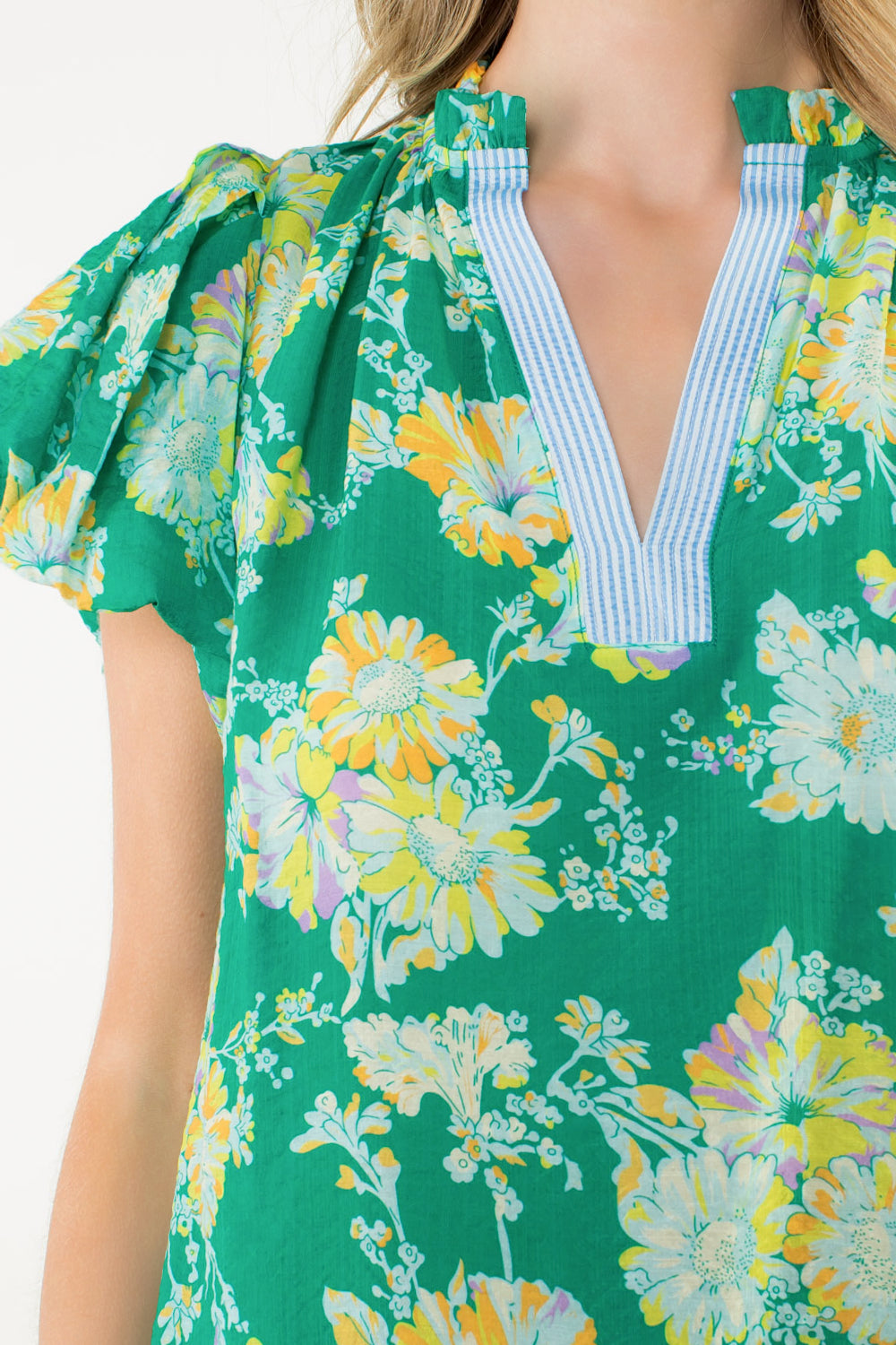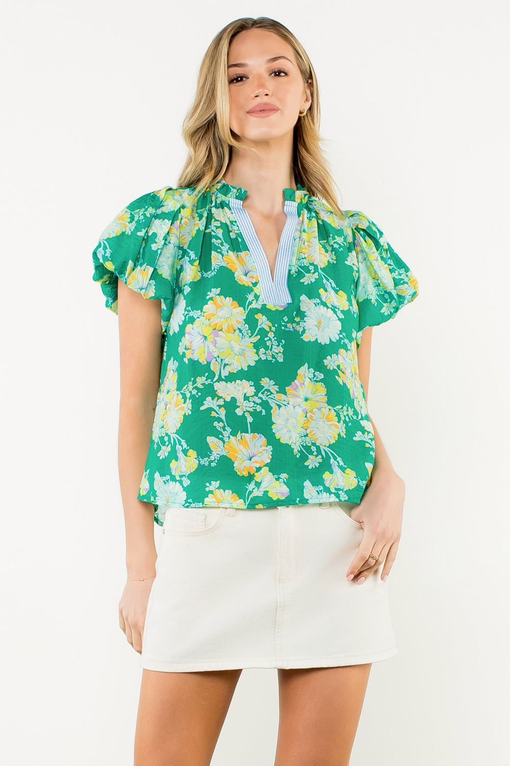 Light and airy. This puff sleeve with contrasting detail on front neckline gives it a fun look. Pair with jeans or shorts.