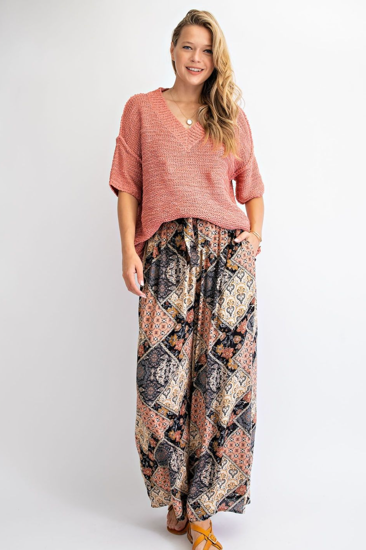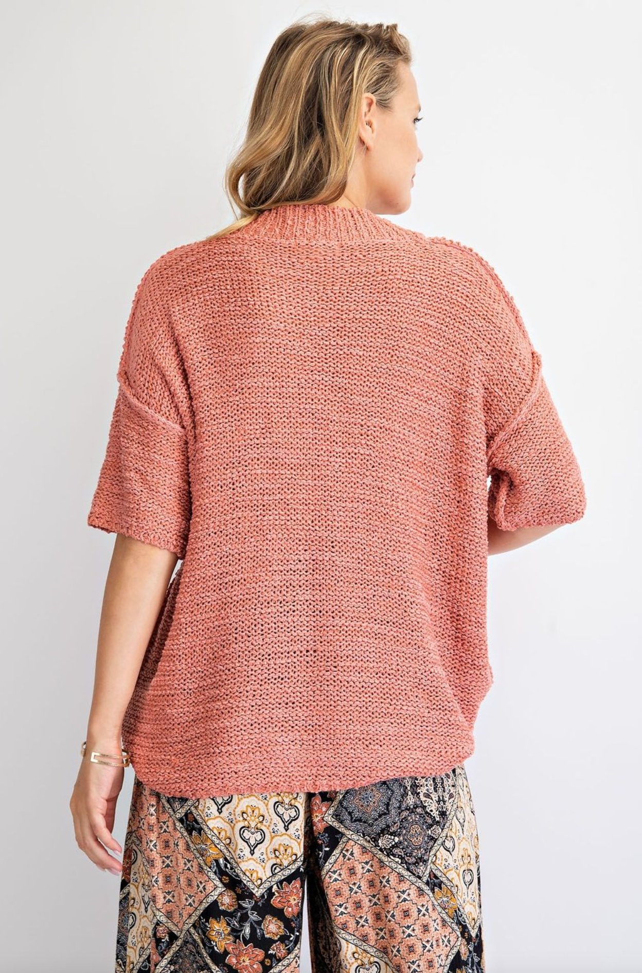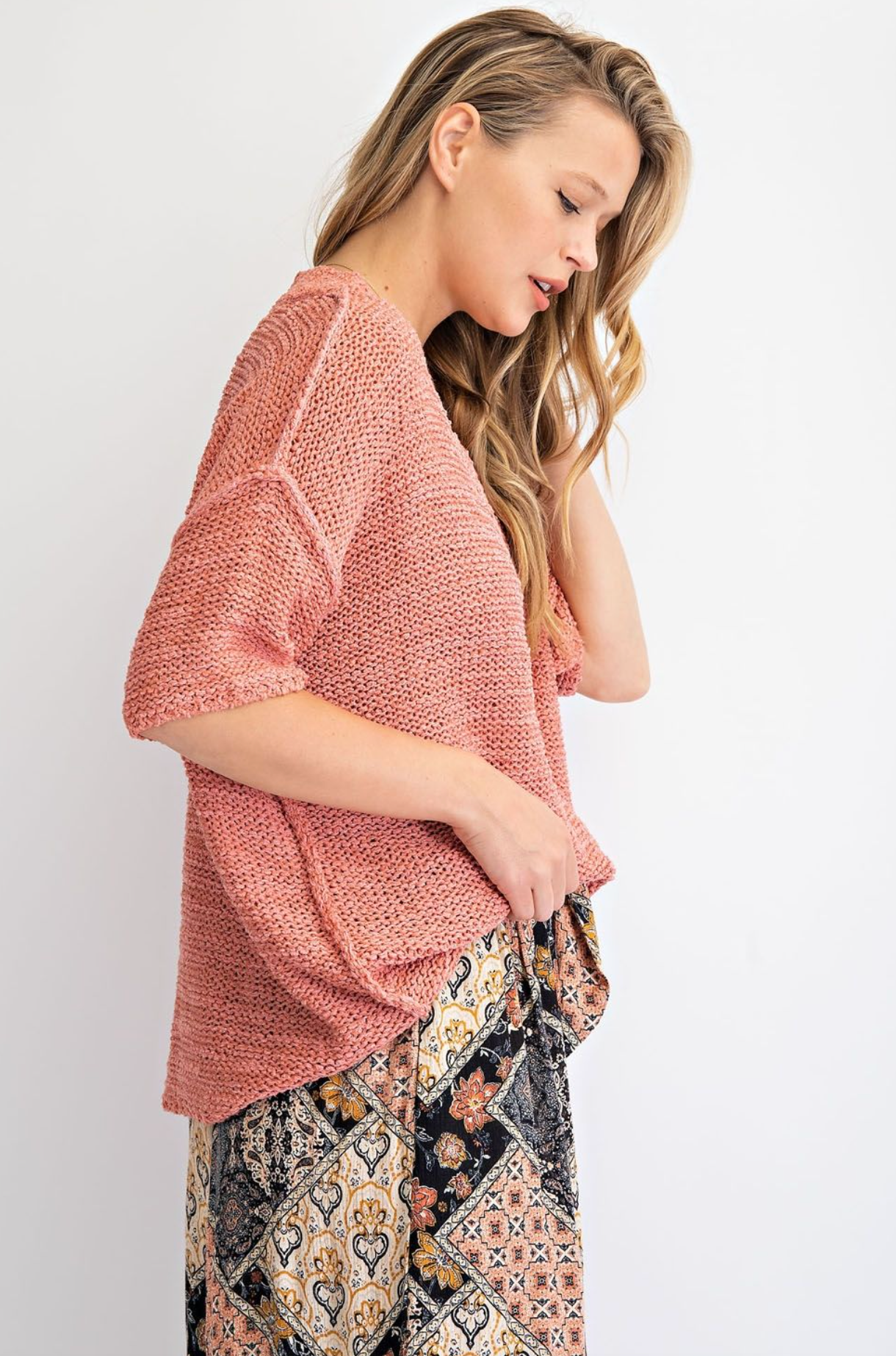 This summer knit sweater is great for a beach day or vacation. Has a ribbed and v-neckline, drop shoulders and short sleeves, relaxed fit and body.