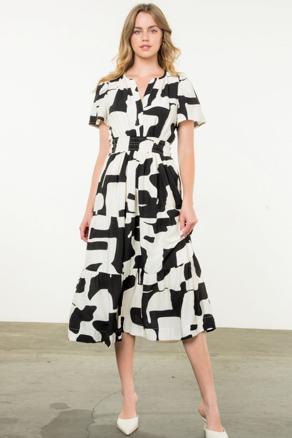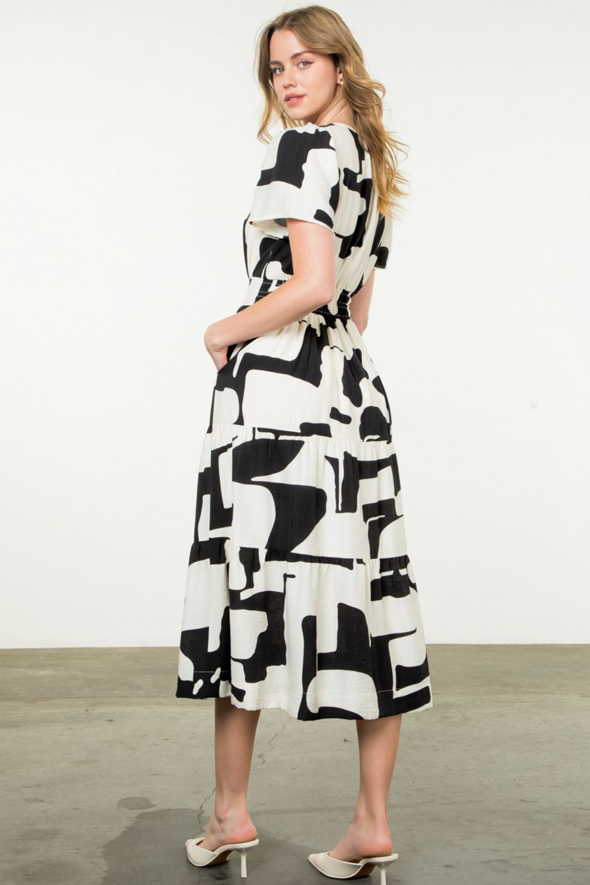 Step into your style in the bold Short Sleeve Tiered Print Dress. With a cinched waist this adds definition to the silhouette and soft flow of the dress. This striking abstract print is the focal point of the dress making it a statement piece in your wardrobe.