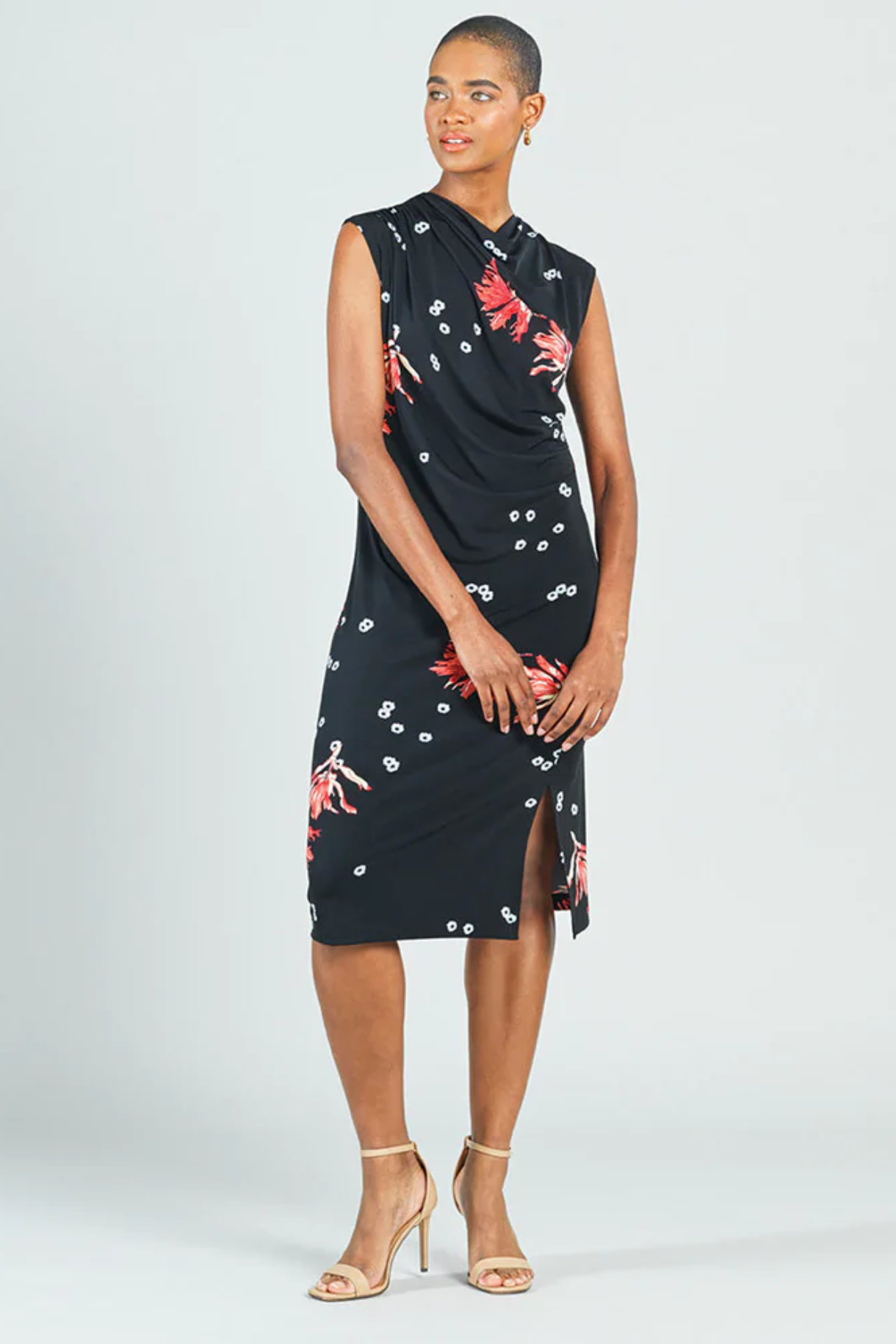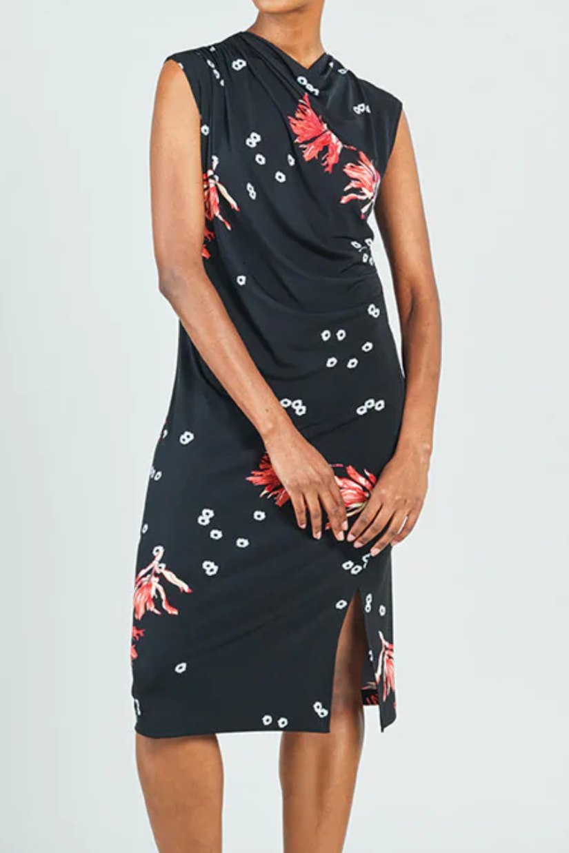 Watch your confidence blossom in our Floral Flake Side Slit Midi Dress! This stunning dress features a high draped neckline, cap sleeves, a ruched side bodice that creates a flattering draped silhouette, and a 10" left side slit with a midi hemline.
