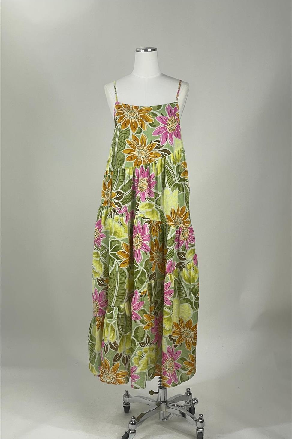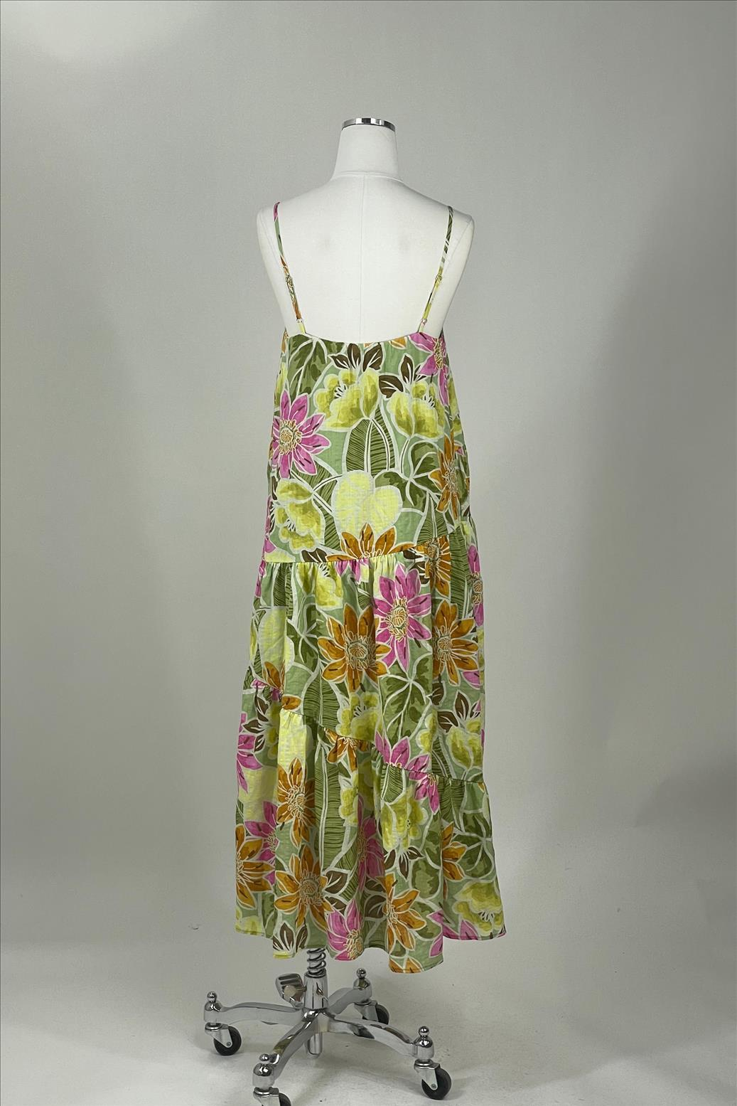Woven Cotton Rayon Floral Print Round Neck Spaghetti Strap Tiered Maxi Dress With Side Pockets And Lining