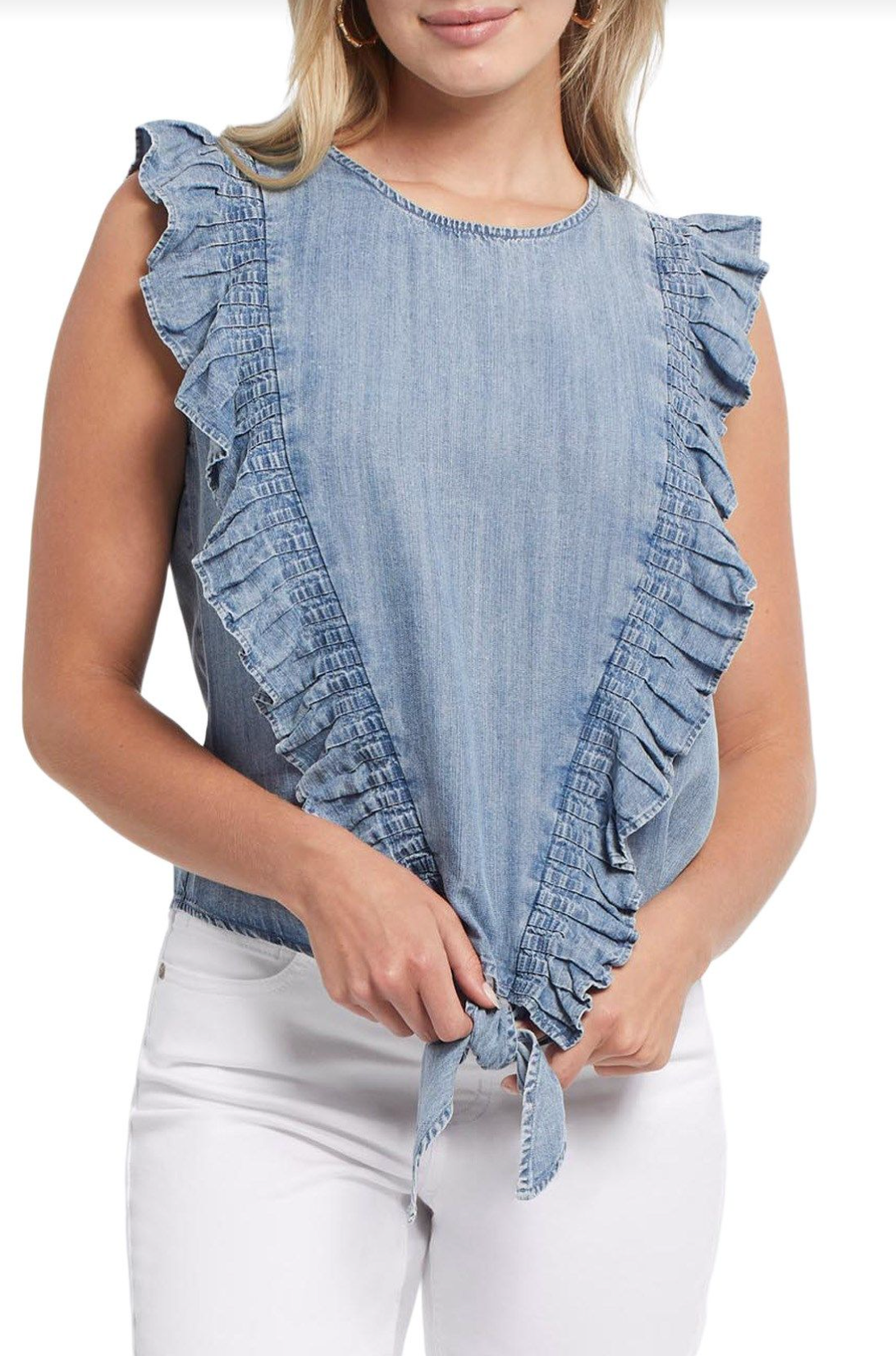 This chambray top looks great with white bottoms. Its a great and easy top to add to the closet.