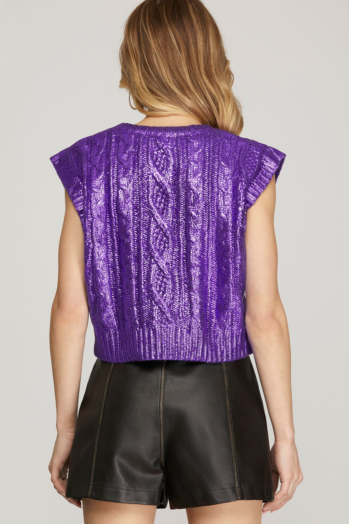 Make a statement in the eye-catching Sleeveless Cable Knit Metallic Cropped Sweater! This sweater has a crew neckline and can be worn on its own or with a long sleeve underneath.