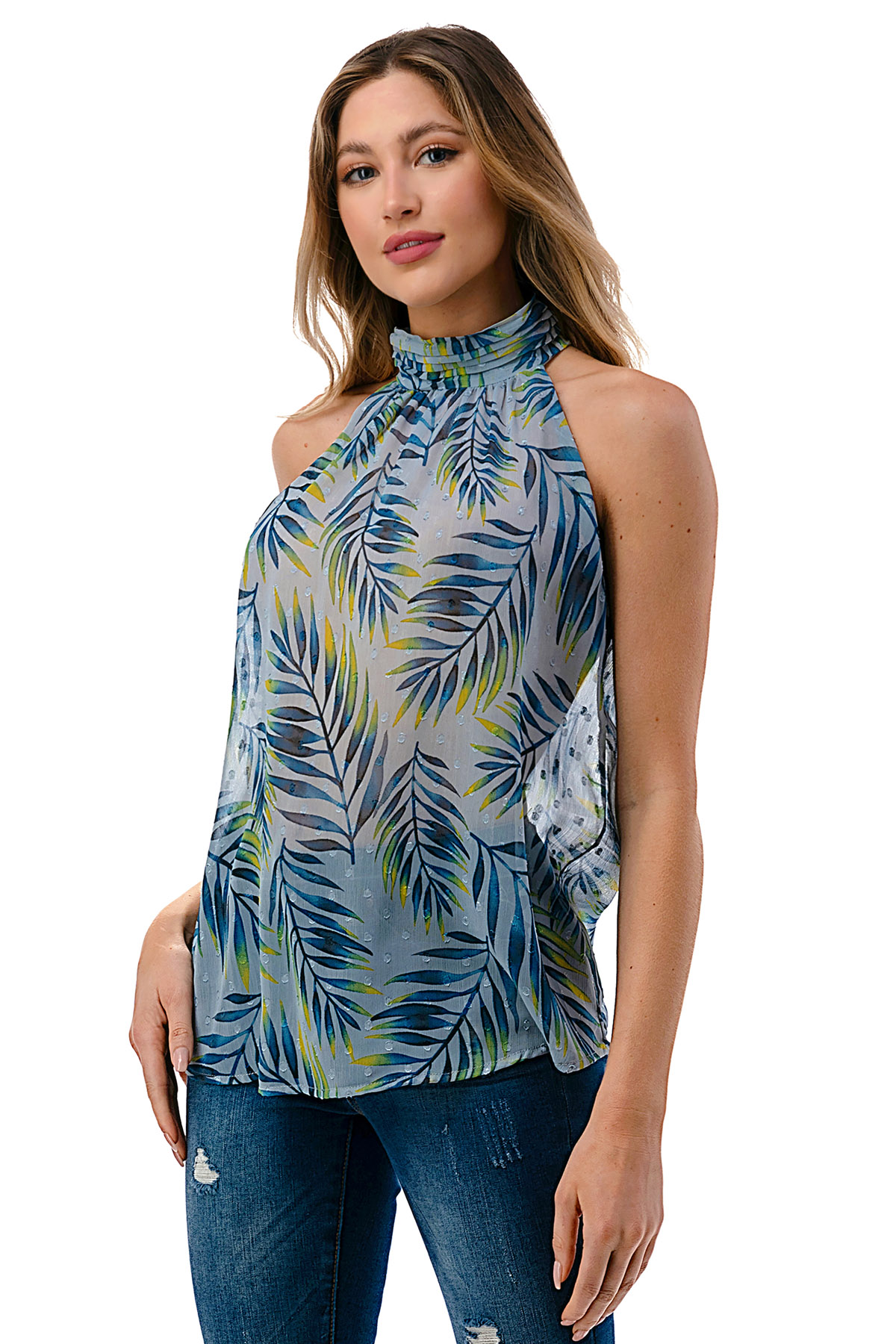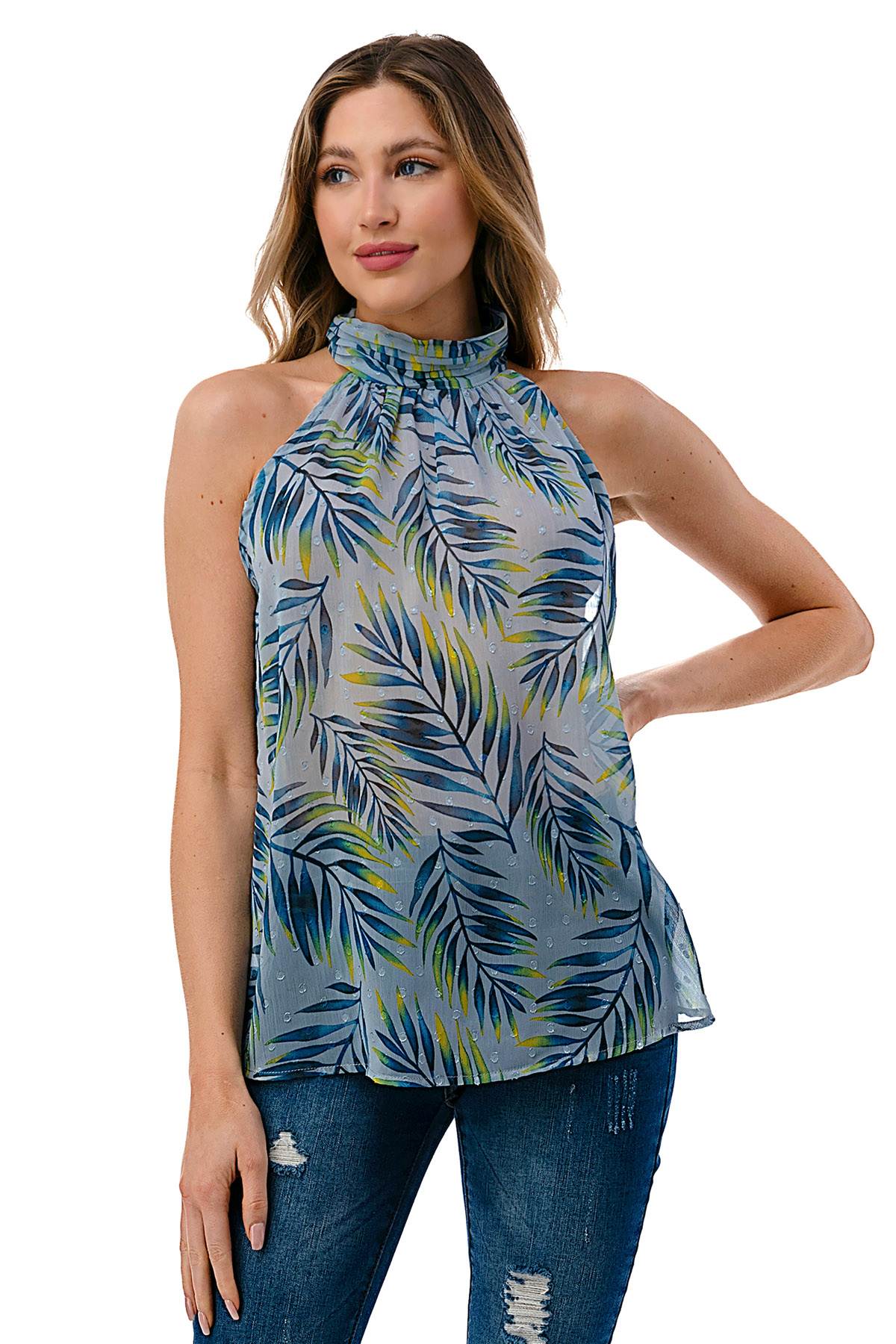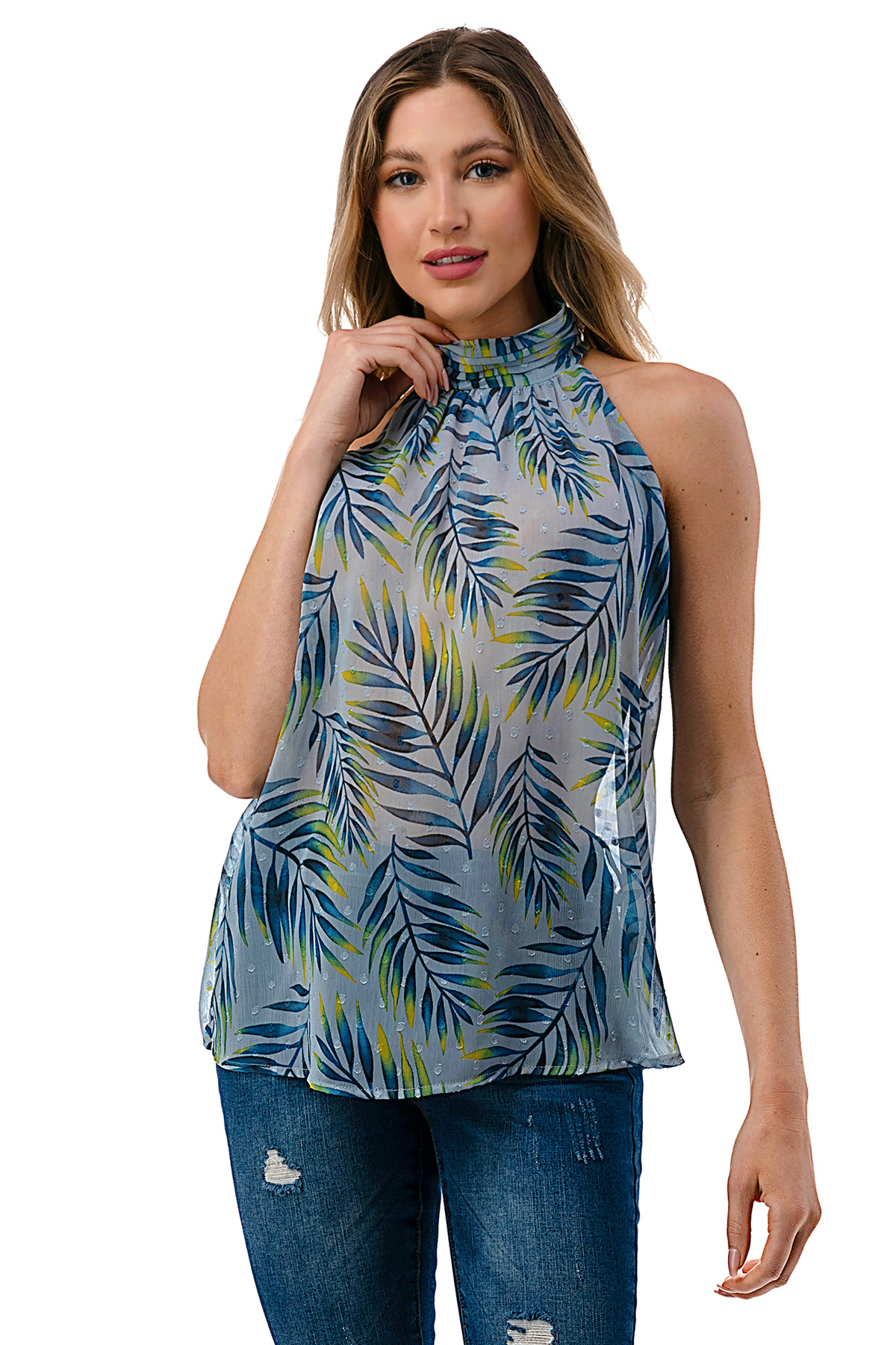 This high-neck blouse is great for summer. The pleated feature dresses the blouse up. Looks great with jeans or white pants