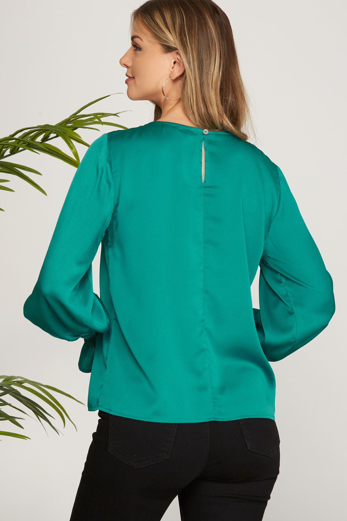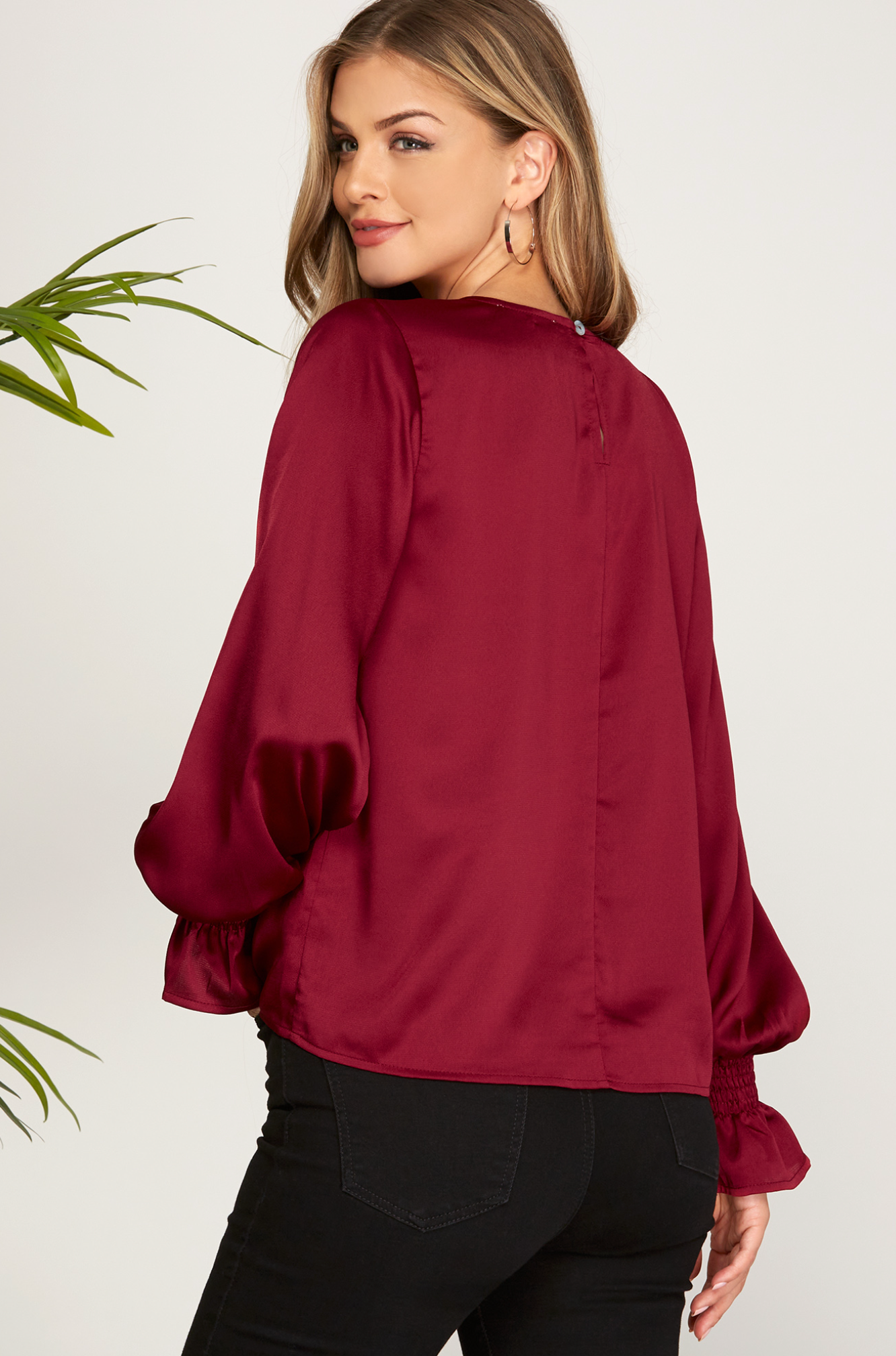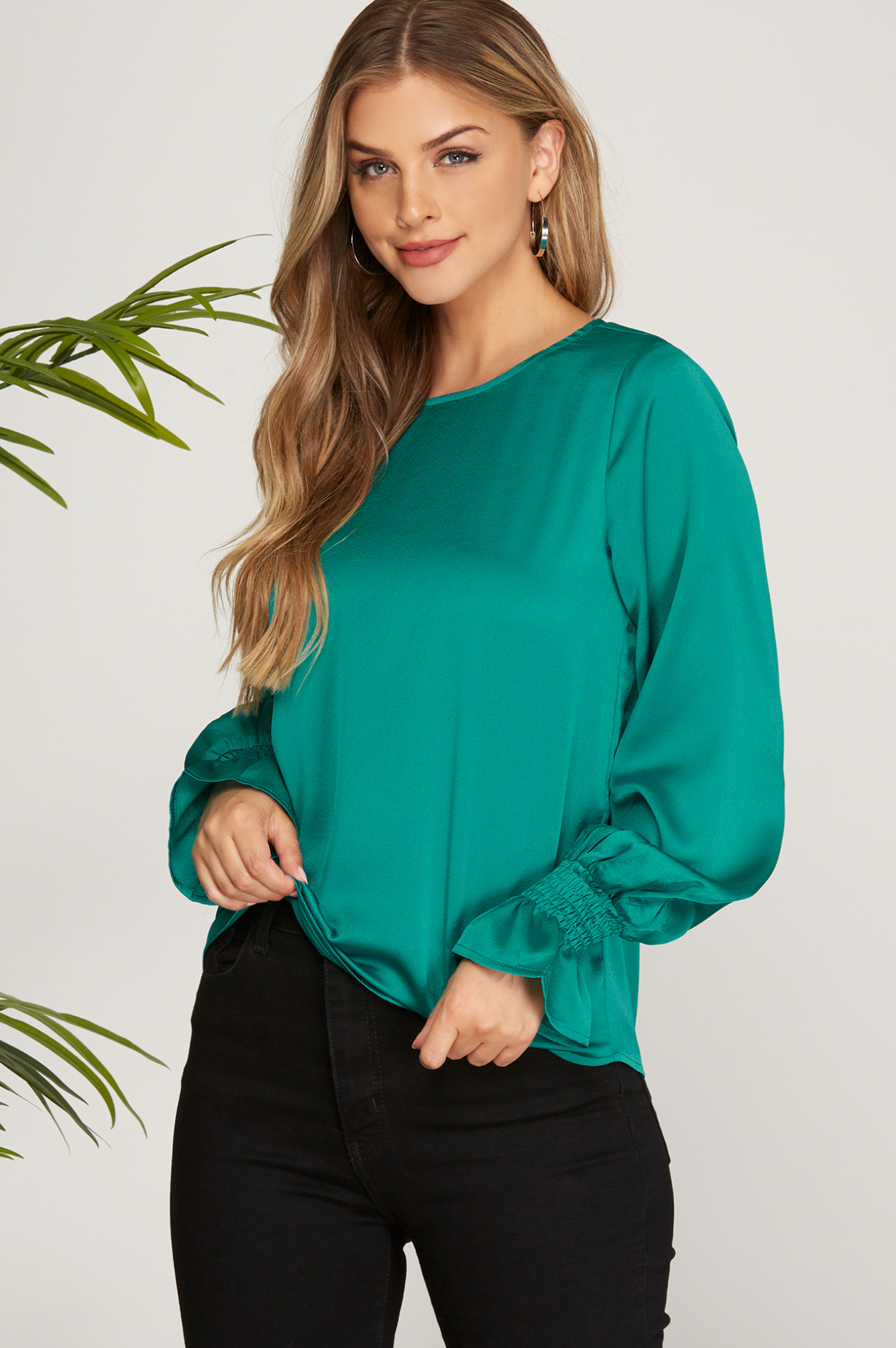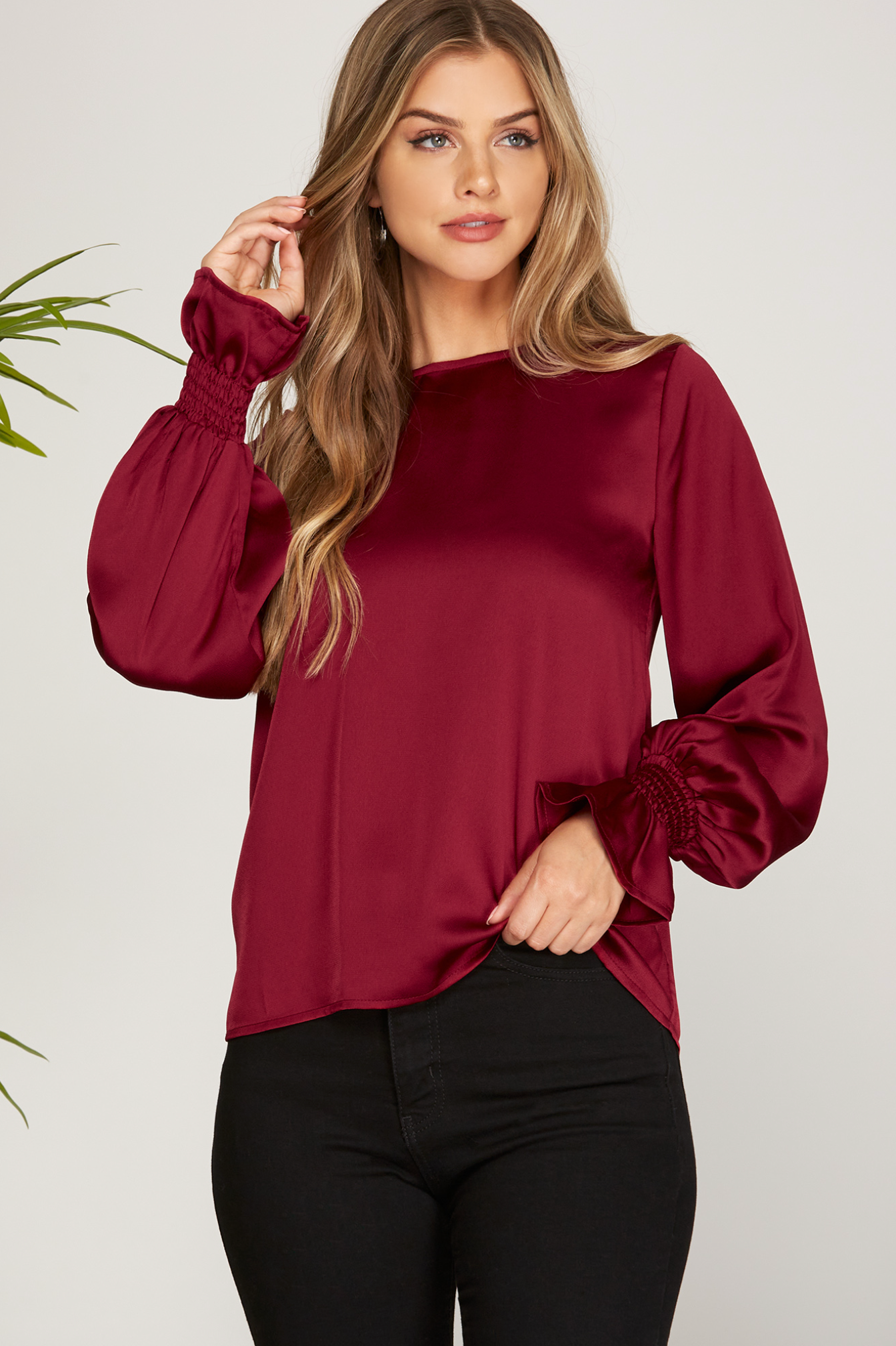 This satin to has a smocking detail at the sleeves and subtle bubble sleeves. Easy to wear casually with jeans or with trousers to the office.