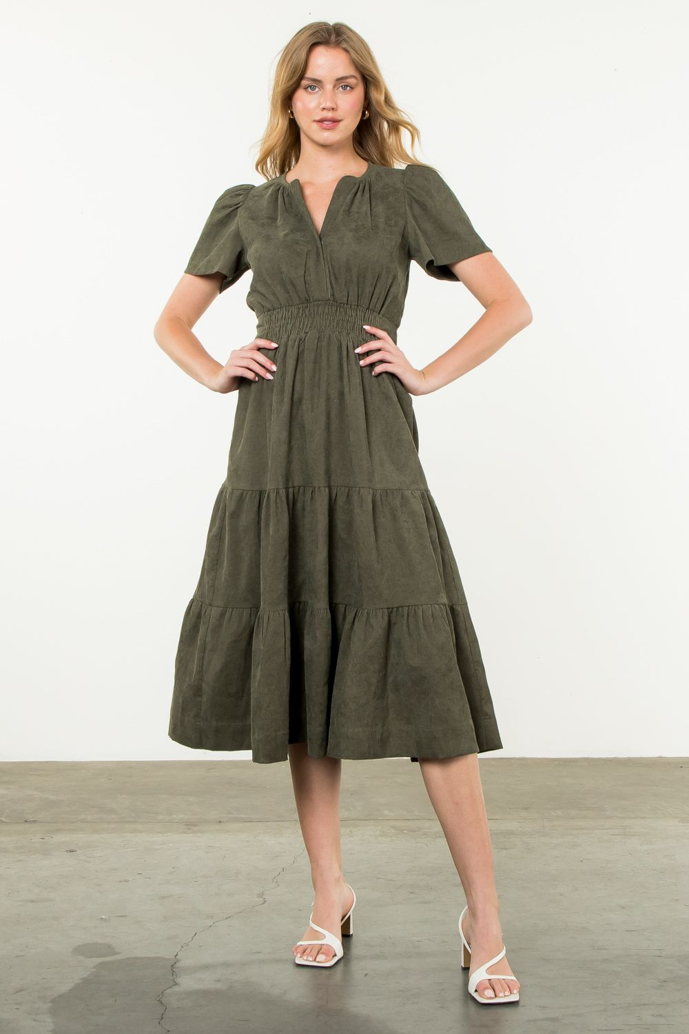 Great fall dress in olive corduroy. Smocked waist gives a flattering fit.