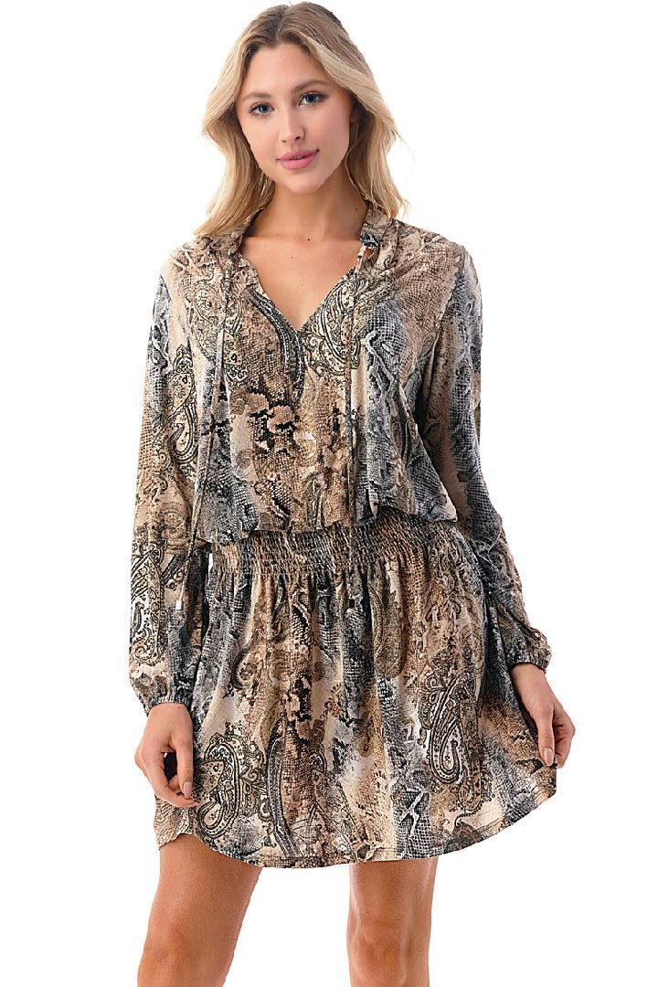 Tear drop neck, smocking waist, figure flattering, travel friendly. Hello must have! Pair with wedge shoes or boots. Model wearing size small.